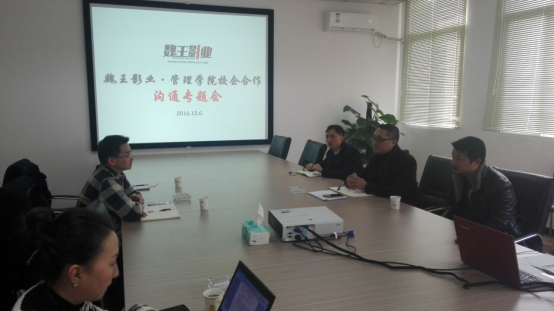 (管理学院)2016年12月6日下午管理学院一行到魏王影业就公司用人需求进行提前对接,并为制定下学期教学计划提供依据,确保用人及时衔接、教学畅通。管理学院院长简玉刚,工程训练中心副主任张金波,校企合作办毛云莹、魏王影业项目部魏总、行政部王总、人力资源部张总一起参加了本次座谈,具体内容如下: