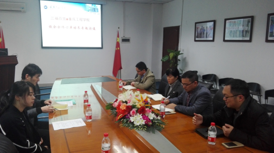(管理学院)2017年3月2日上午9点,在实习楼104会议室,管理学院院长简玉刚、市场营销系主任朱凤、副主任刘章勇、周小波,管理学院工程训练中心副主任张金波与来访的福建三福百货西南大区人力资源部经理付莎,西南大区招聘配置主管赵磊等人就市场营销本科班订单培养进行沟通。