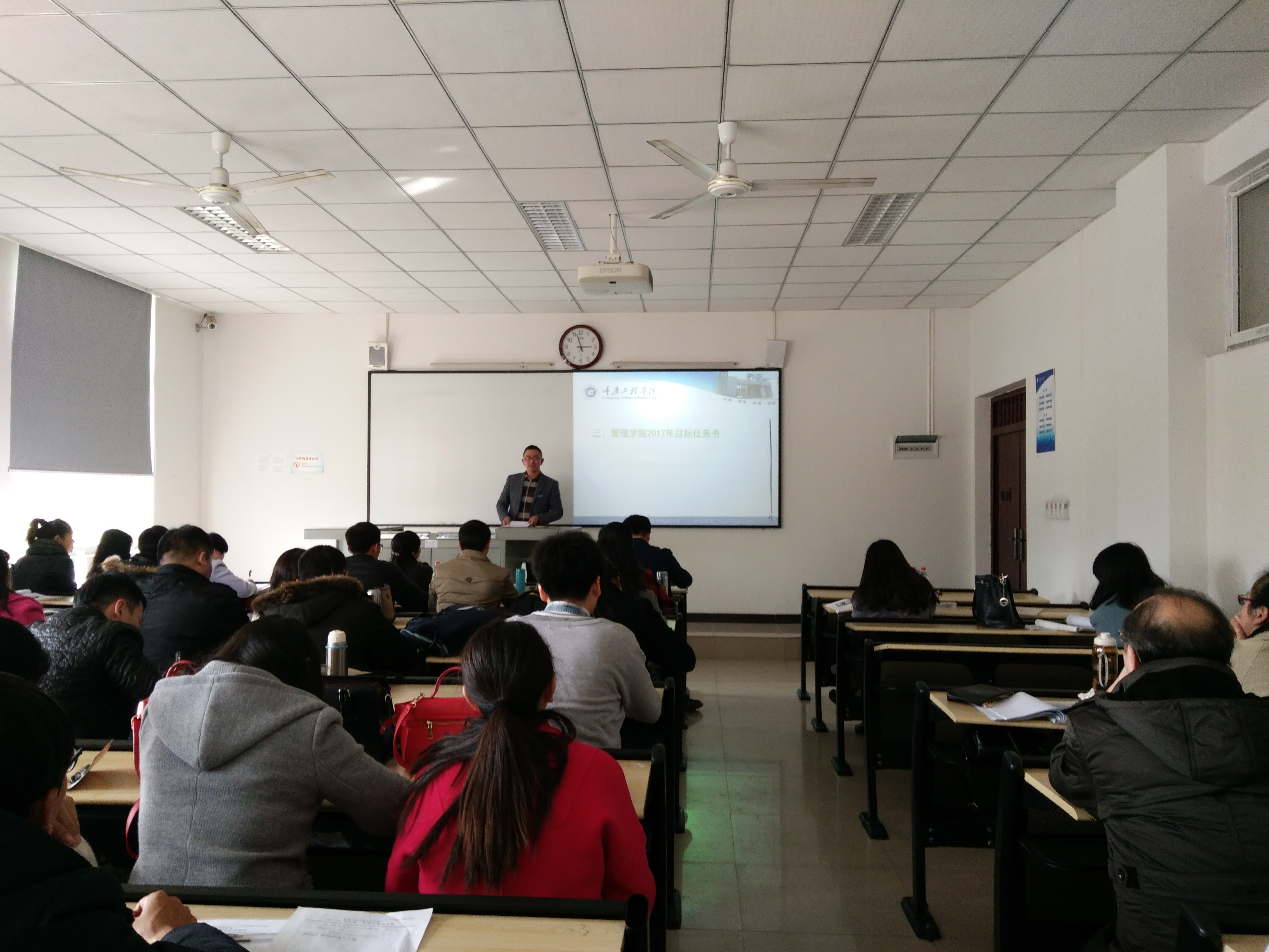 首先,管理学院副院长李玲就期初总体教学情况进行了反馈,提醒教师严格执行课堂秩序管理办法,并对学院三月份的重点工作进行了安排;其次,管理学院党总支书记熊力根据学校相关会议精神,为全体教师详细解读了管理学院2017年目标任务书;然后,管理学院院长简玉刚对本年度的重点工作进行了部署,简院长强调安全意识是一切工作的前提,在明确本年度工作目标的基础上,管理学院应重点抓好团队建设、专业建设、课程建设、学生工作、招生工作、就业工作、教科研工作等八大方面的工作,同时对各项工作提出了明确的标准。