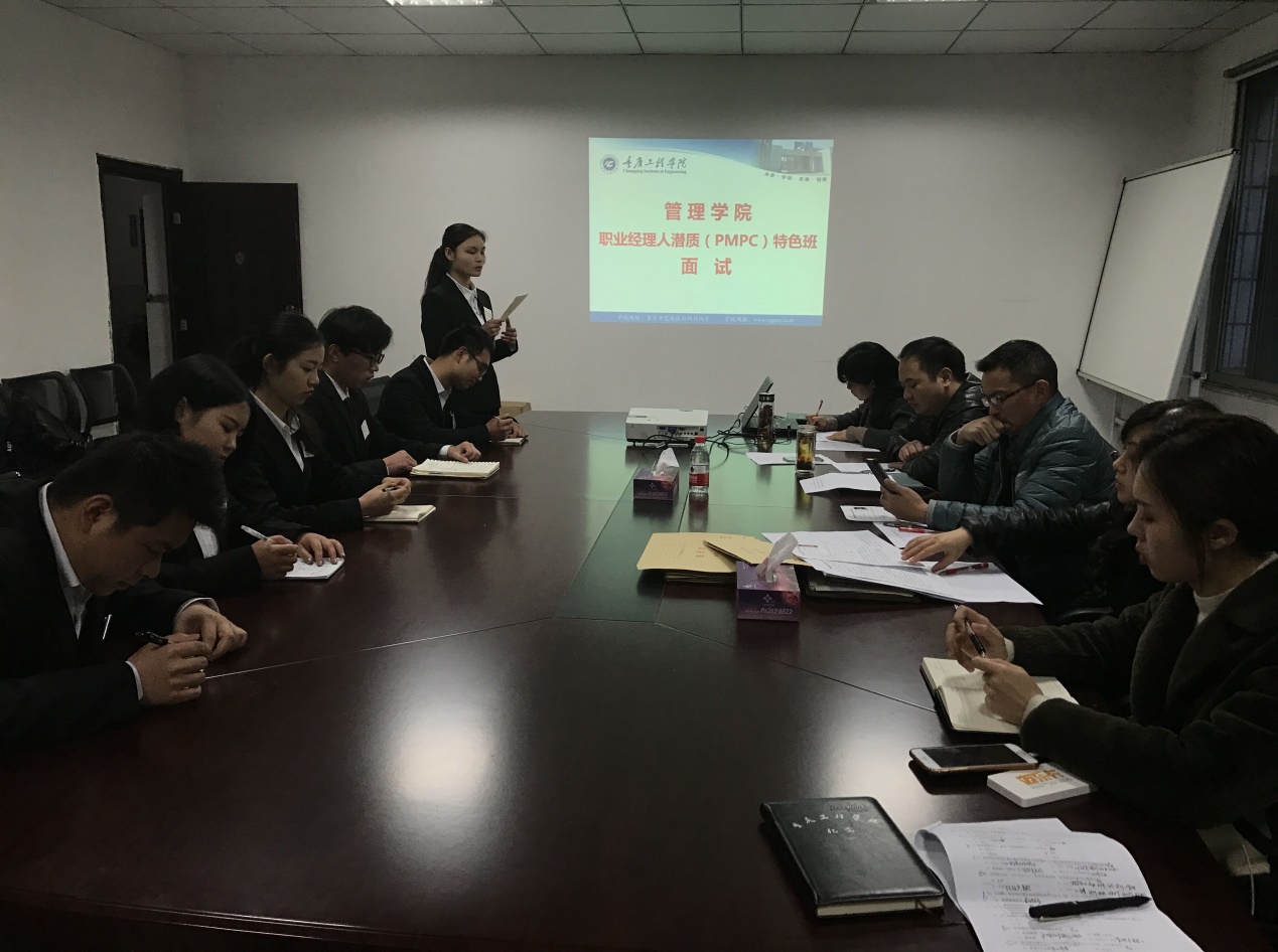 为了培养更优秀的复合型、高素质、高技能应用型管理精英人才,紧扣培养职业经理人的人才培养目标,管理学院经过前期报名环节及“面试流程说明会”的精心准备,于2017年3月15日,由管理学院执行院长简玉刚、书记熊力、副院长李玲、工商管理系主任朱凤、电子商务系主任宋方伟、罗春燕老师及市场营销本科班的辅导员组成的评委小组,在第三教学楼顺利完成了“职业经理人潜质(PMPC)特色班”68名学生的考核招募工作。所有学生经过英语口语和小组讨论两轮面试的激烈角逐,最终选出了30名英语口语及综合素质较强的学生进入到“职业经理人潜质(PMPC)特色班”进行学习。顺利圆满的完成了2015级“职业经理人潜质(PMPC)特色班”的组建工作。