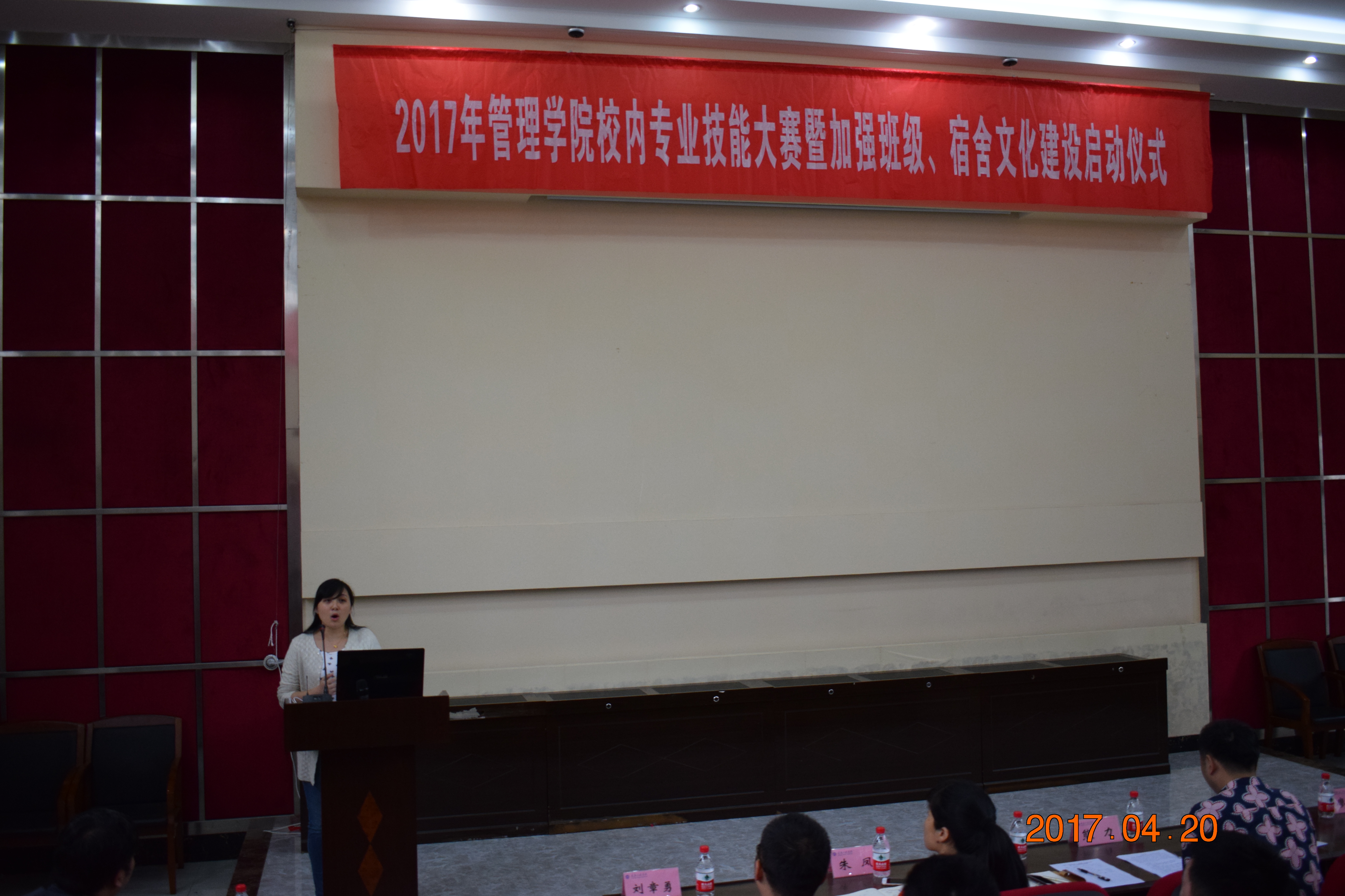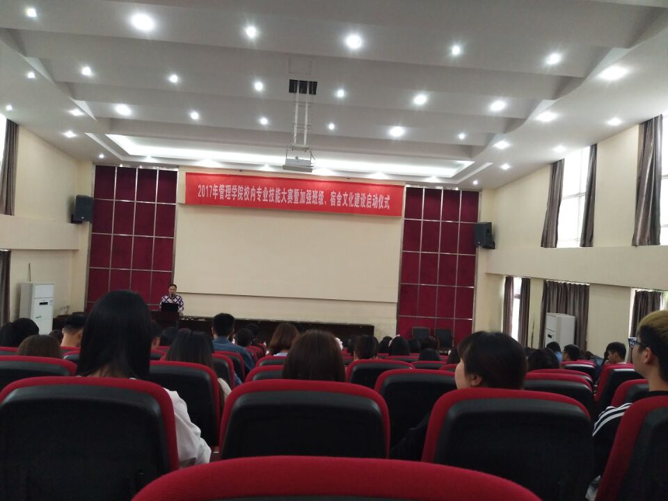 2017年4月20日下午4:00管理学院在学校阶梯报告厅成功召开本学期专业技能大赛暨班级、宿舍文化建设启动会,学院党总支书记熊力,副院长李玲,各专业教研室主任,学生代表近200余人参加,会议由张金波老师主持。