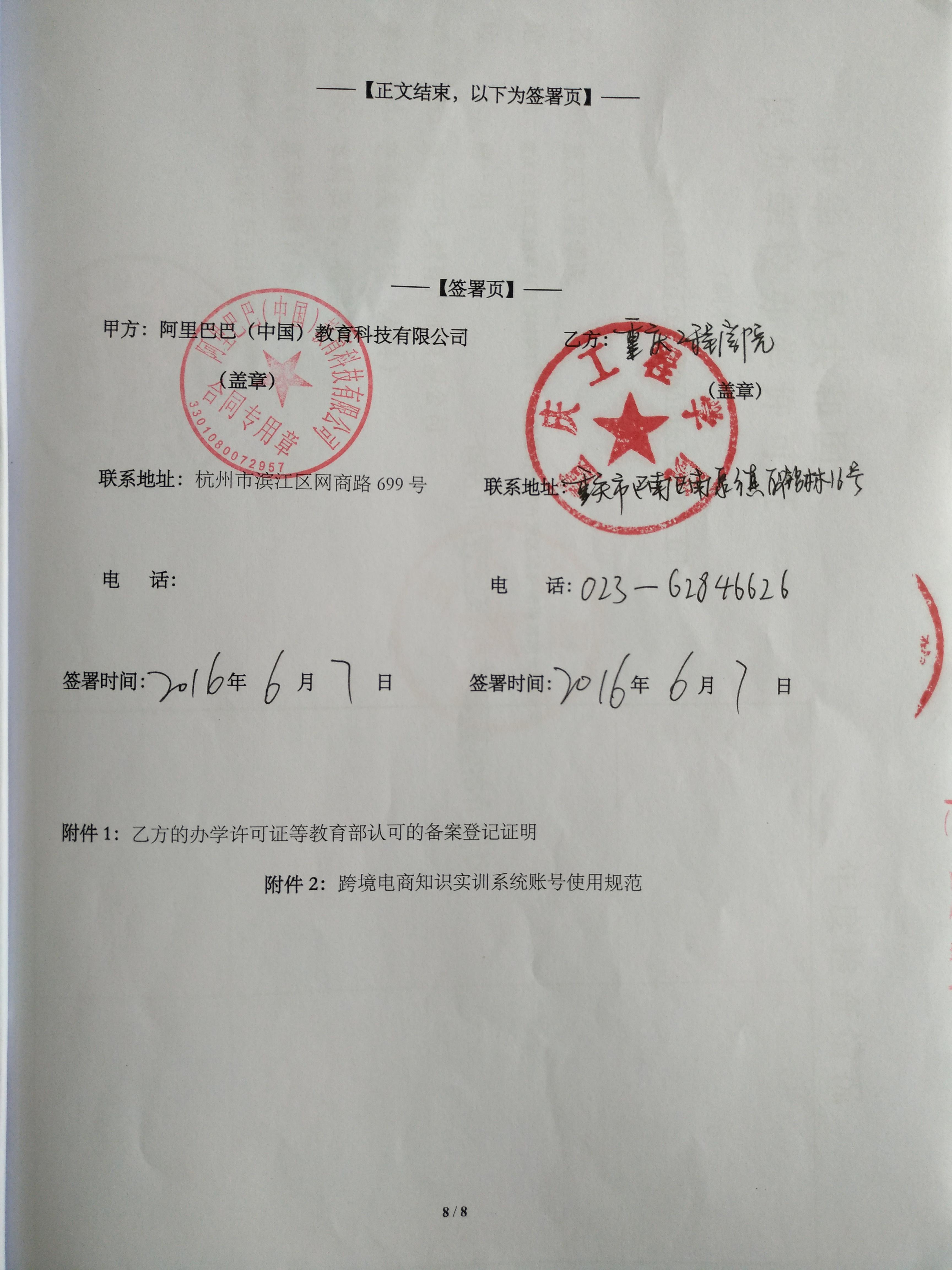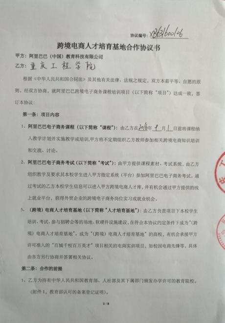 2016年6月20日,管理学院与阿里巴巴(中国)教育科技有限公司正式签署跨境电商人才培育基地合作协议,我校正式成为“阿里巴巴(跨境)电商人才培育基地”,双方将就阿里巴巴电子商务课程、阿里巴巴电子商务考试和(跨境)电商人才培育三大方面启动合作。