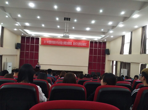 2017年4月20日下午4:00,管理学院在学校阶梯报告厅成功召开本学期专业技能大赛暨班级、宿舍文化建设启动会,学院党总支书记熊力,副院长李玲,各专业教研室主任,学生代表近200余人参加,会议由张金波老师主持。