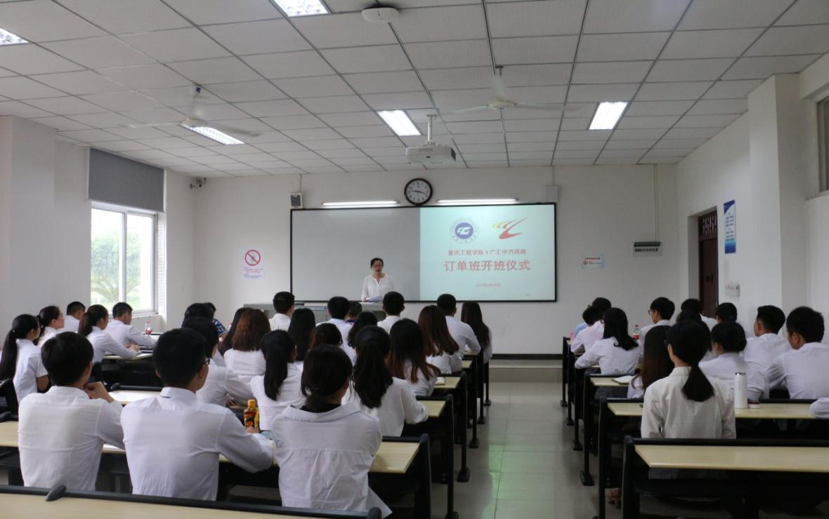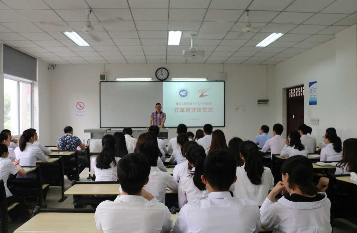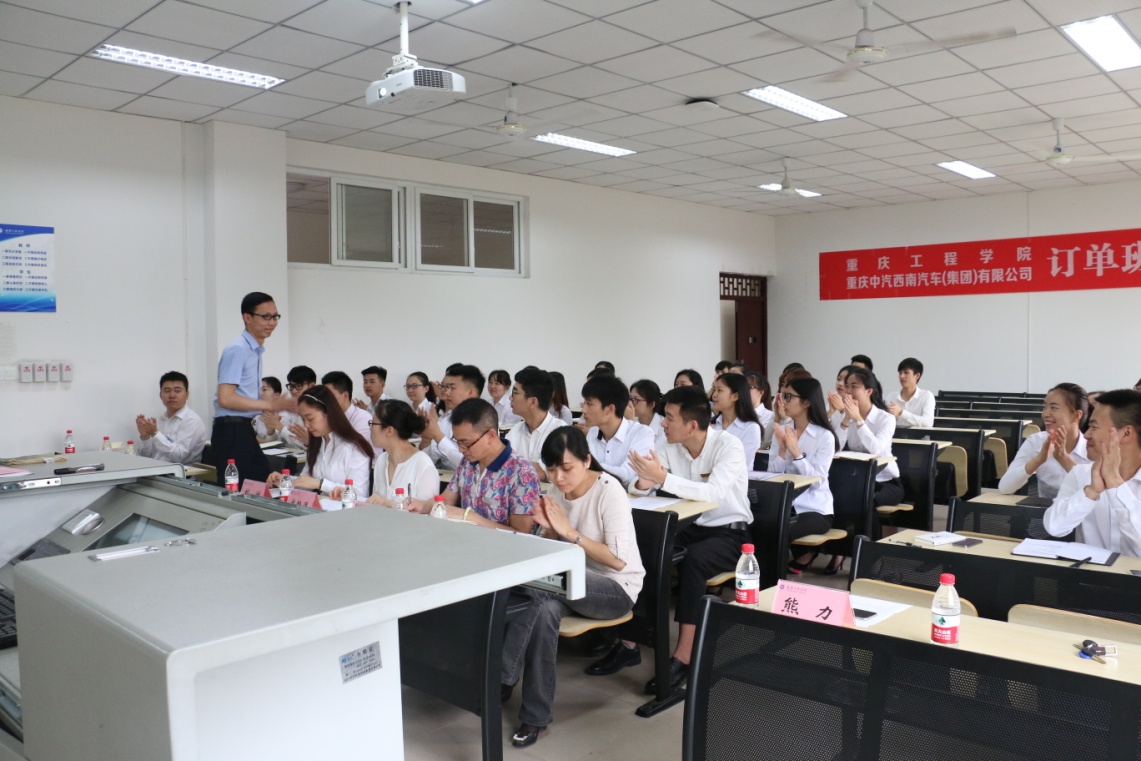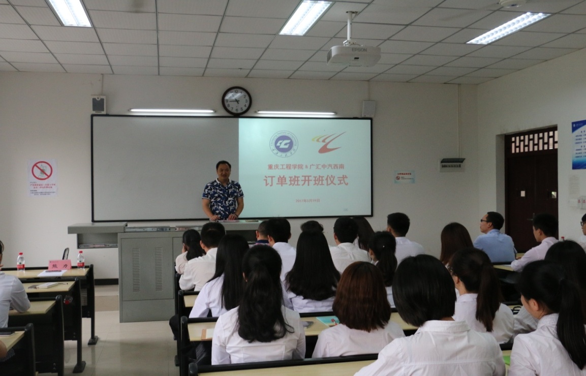 2017年5月19日上午9:00,同学们期盼已久的重庆工程学院与重庆中汽西南汽车有限公司校企合作订单培养班(以下简称中汽西南订单班)的开班仪式在六教115教室隆重举行,广汇中汽西南人力资源副经理宋艳萍,招聘主管刘浏,内训师辜量;重庆工程学院管理学院执行院长简玉刚,党总支书记熊力,副院长李玲,中汽西南订单班班主任杨睿以及市场营销专业辅导员黄平,徐梦琳参加了本次开班仪式。本次开班仪式由管理学院党总支书记熊力主持。
