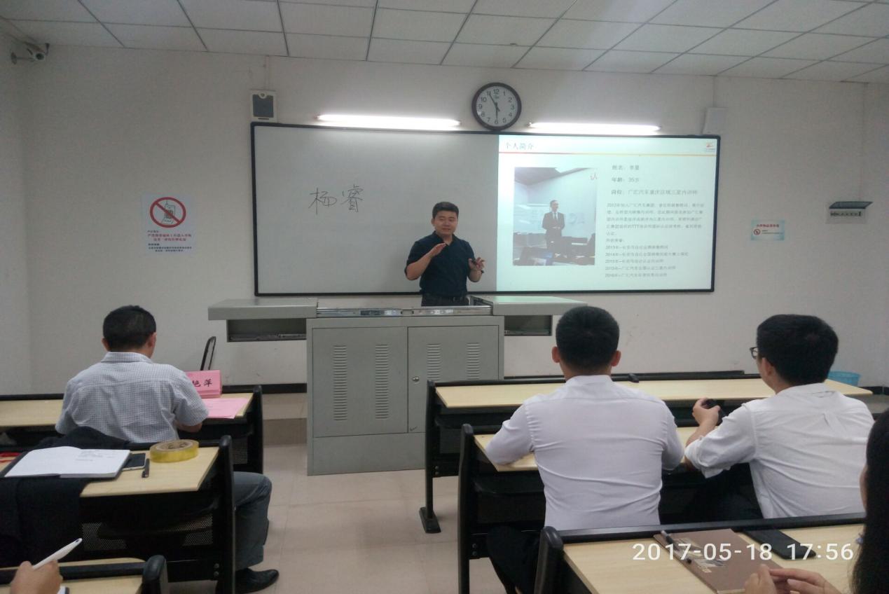 随后班主任杨睿介绍了订单培训班的三位培训师,分别是广汇三星内训师辜量,广汇星顺客服经理周雪峰,广汇重庆美凯市场经理金海斌。最后班主任杨睿鼓励大家在今后的培训学习中尽力尽责,尽善尽美,努力成为一名合格的汽车销售人员。