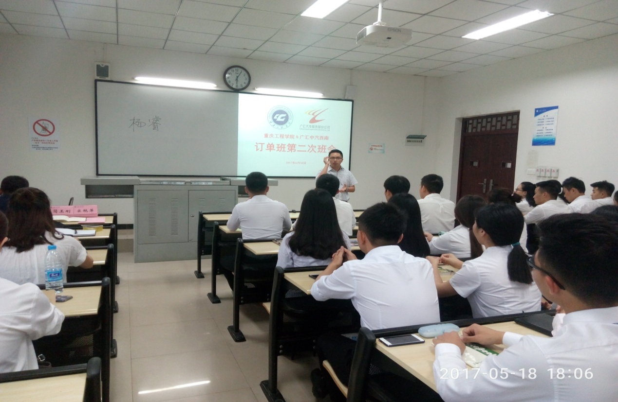 2017年5月18日18:00,管理学院中汽西南订单班第二次班会在六教115举行,管理学院周小波老师,订单班班主任杨睿,中汽西南订单班全体同学参加了本次班会,班主任杨睿老师担任本次班会主持人。