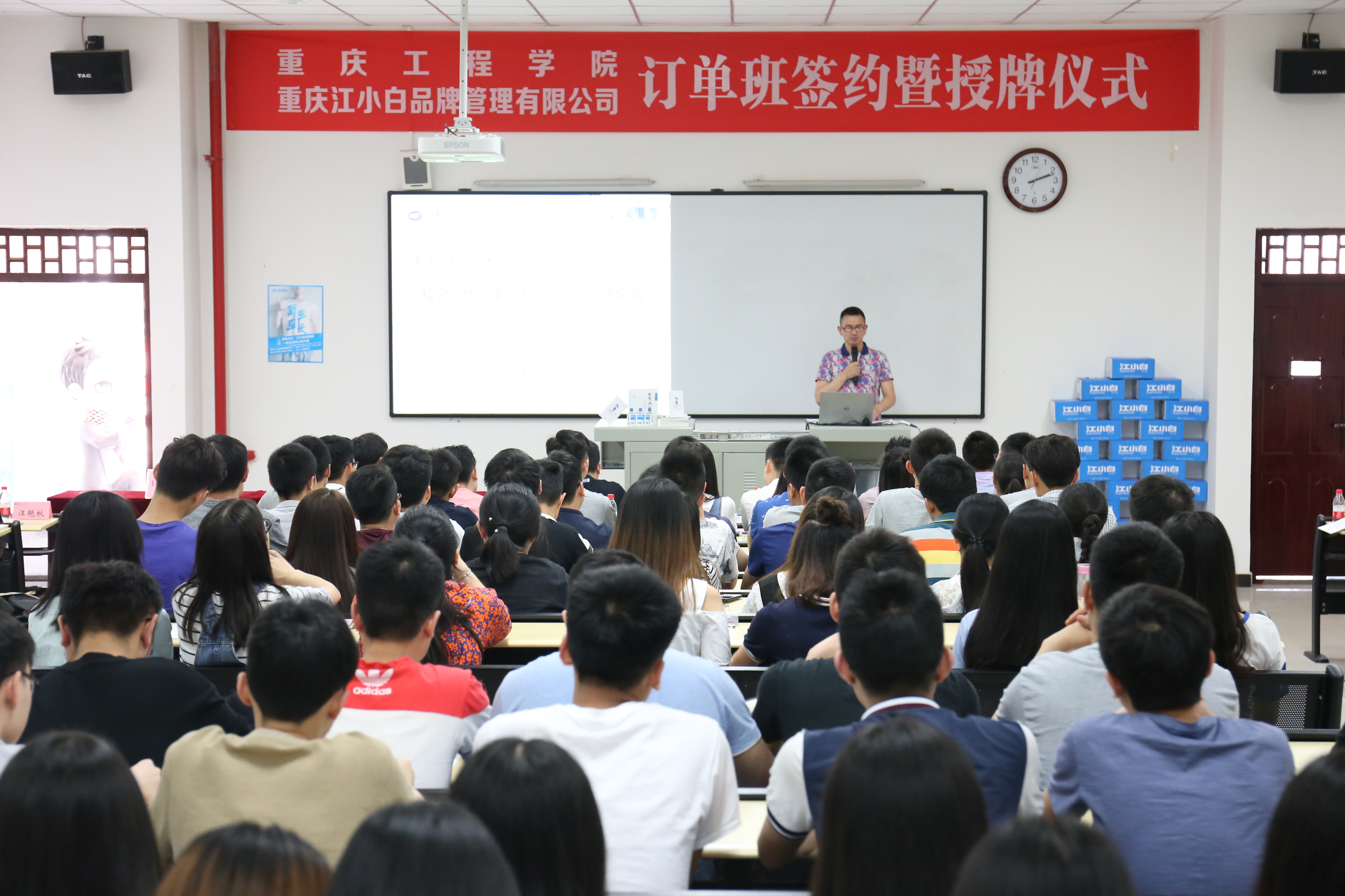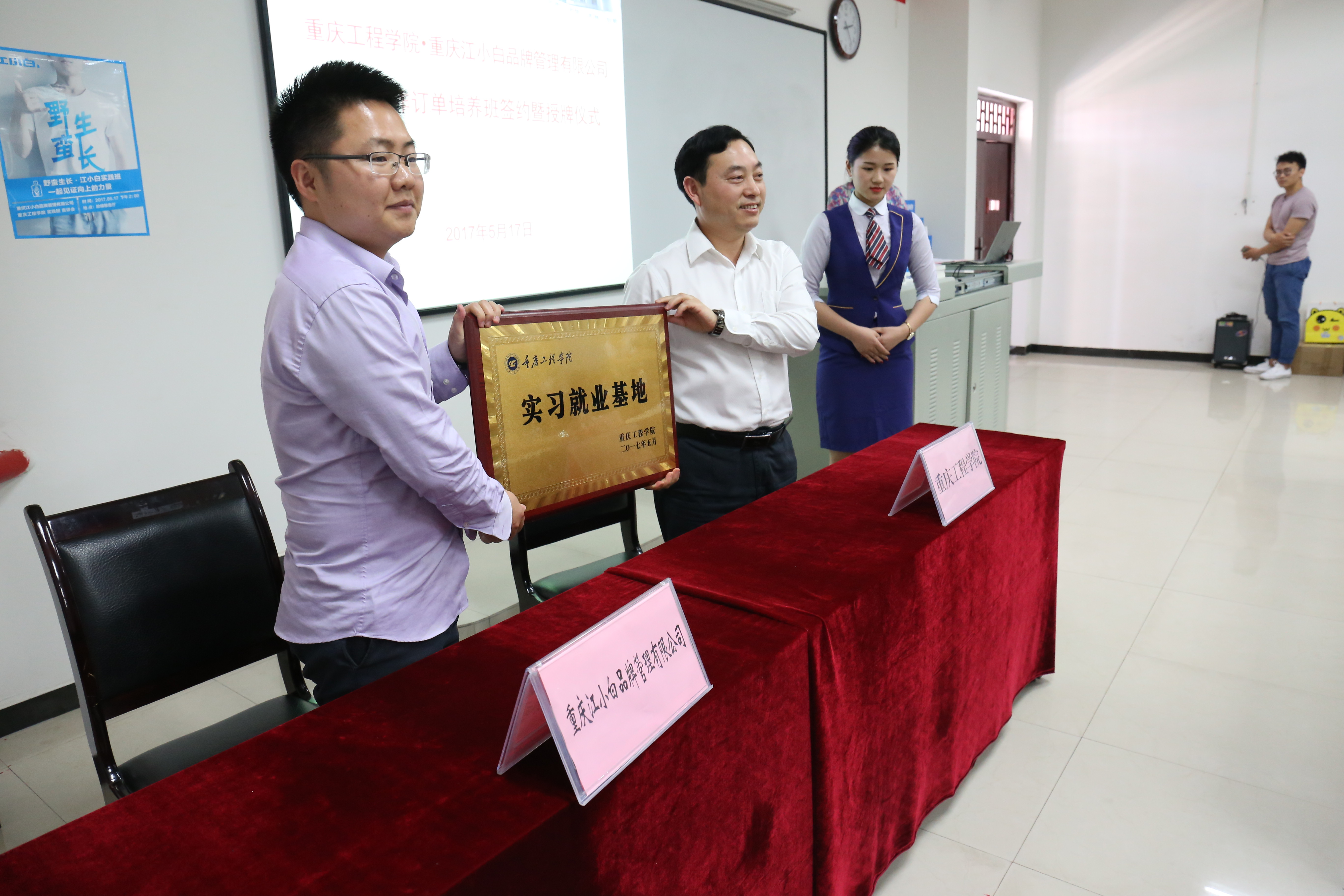 2017年5月17日,我校与重庆江小白品牌管理有限公司(以下简称江小白公司)在第六教学楼203教室举行了订单培养班签约暨授牌仪式。我校党委书记兼常务副校长张业平、招生就业处处长王建东、教务处副处长罗桓、管理学院执行院长简玉刚、江小白公司组织部常务副部长兼人力资源副总监汪应伟、市场拓展部副总监兼总经理助理胡小明、人才学院项目主管林晶、组织部培训专员汪艳秋等人出席了本次签约仪式。