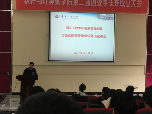 2017年10月12日 14:00,重庆工程学院管理学院院长简玉刚针对2014级毕业班的全体学生在行政阶梯报告厅举办了一次品智集团订单培养班招聘宣讲会。