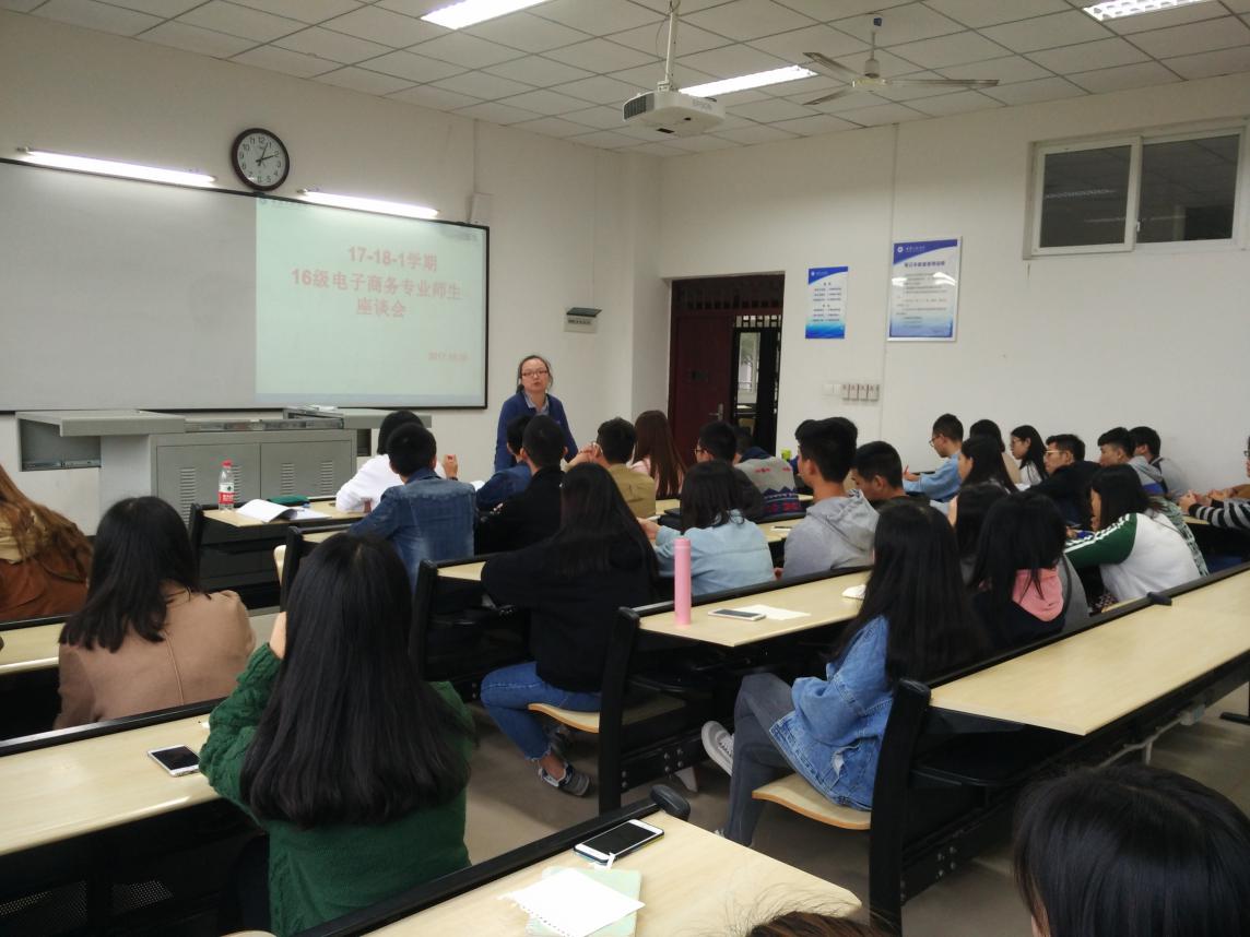 接下来,大家又和16级电子商务本科的学生进行了学情交流。芦亚柯老师也对电子商务课程内容的现状和发展方向进行分析讲解。然后由学生提出在课程的学习中遇到的问题。其中有学生指出,有的课的课程进度有点紧,很多内容知识点比较分散。相关老师针对这个问题进行解答,因为很多学生还在向高中那样过度依赖课堂、教材而忽略了其他的延展性的相关知识的自学能力的培养。还有同学指出课程在网络教学平台上下载下来,发现自己还是有知识盲区,有些知识在课堂上并没有消化掉。相关老师也说,大家在私下如果遇到知识的难点,都可以随时跟相关代课老师沟通,老师们也会及时的帮助学生答题解惑。还有的同学比较担心大二才开始接触大量的专业知识,会不会在毕业的时候来不及,知识构建会比专科的慢。芦老师也解答到,本科的人才培养方案和专科的培养方案是不同的。专科学生主要是学习专业技能知识,而本科学生除了专业技术技能以外,知识体系的构建的思维方式的构建更为重要,所以在学习中会多花更多的时间和精力去构建。