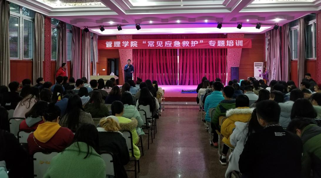 为了加强安全健康教育,增强师生面对突发伤害的应急措施,提高师生们在突发事件中的应急救护能力,12月14日晚6:30,管理学院在1教3楼多功能厅举办“常见应急救护”安全专题培训讲座,担任本次主讲嘉宾的是重庆市巴南区第四人民医院外科医师林晓楠医师。共计150多人参加了此次专题培训讲座。