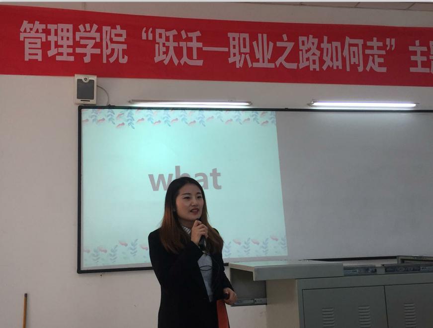 为进一步加深我校学生对职场环境及就业形势的了解,帮助同学们充分认知职业岗位,树立职业生涯规划意识,提早调整自身以适应企业环境,引导学生树立职业规划意识。12月19日下午14:00,管理学院近举办了主题为“跃迁—职业之路如何走”的主题讲座。邀请到PICC中国人民保险股份有限公司销售总监梁柯女士到校为同学们展开讲座。