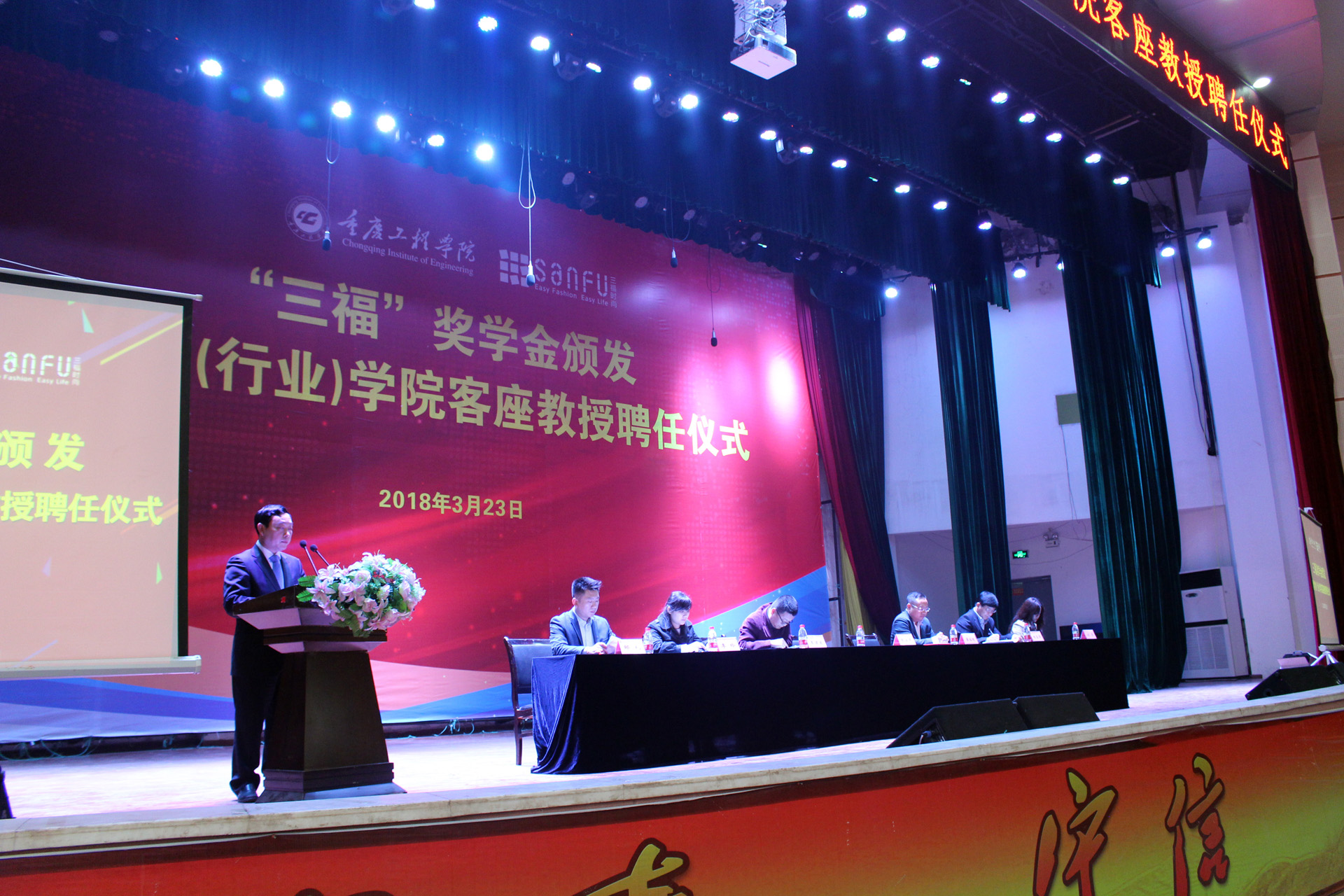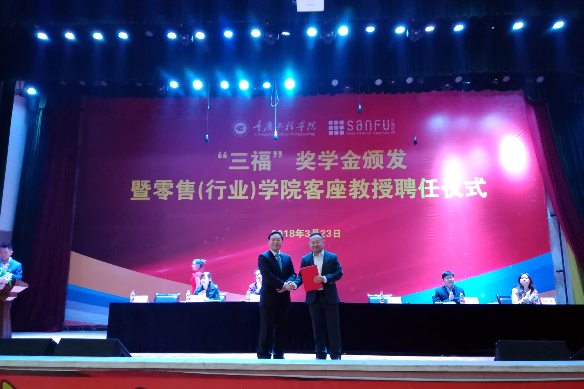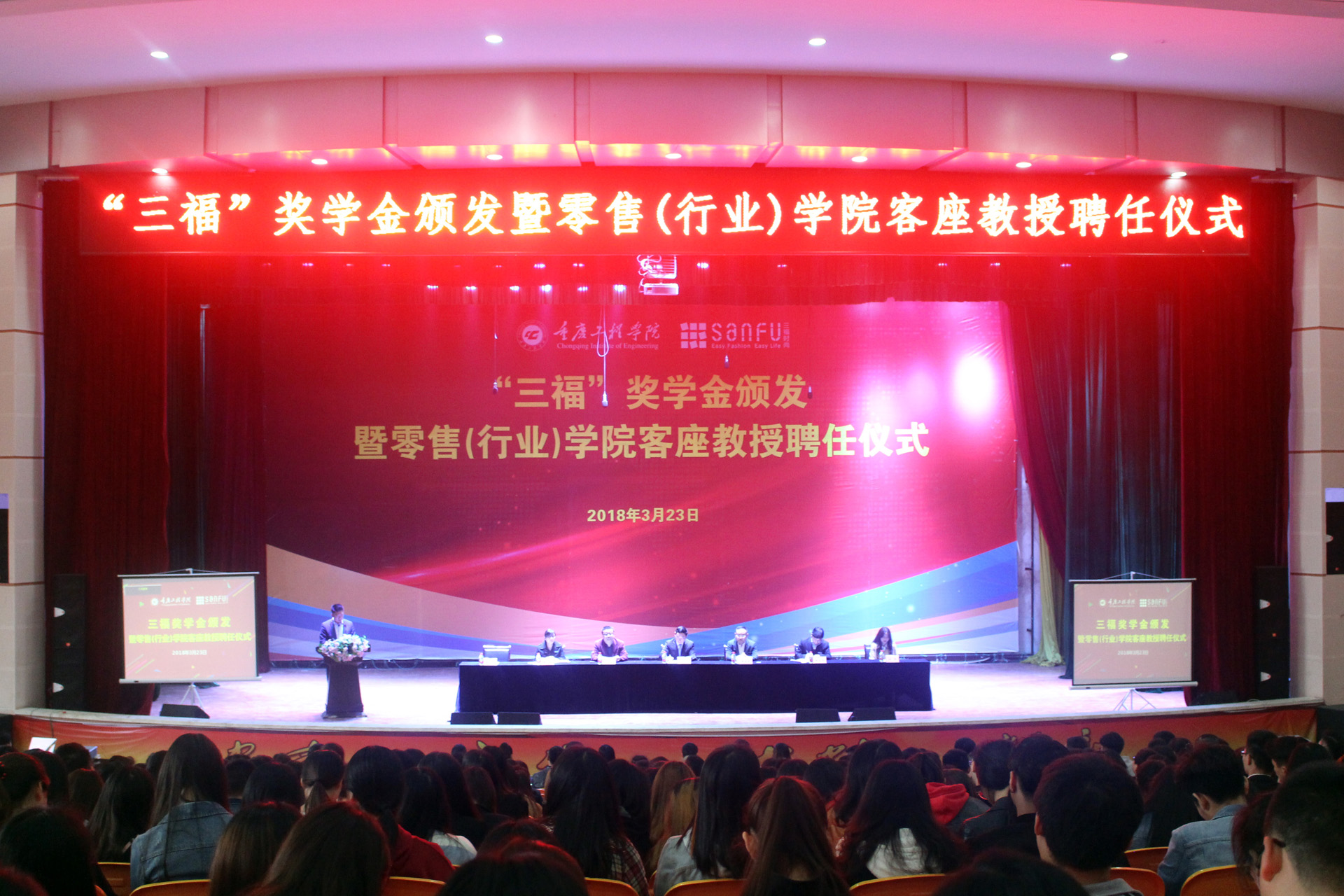 为了进一步深化产教结合发展模式,推动专业发展,促进优良学风的形成。2018年3月23日下午2:00,管理学院在学术报告厅举行了“三福”奖学金颁发暨零售(行业)学院客座教授聘任仪式。福建省三福百货有限公司西南大区总经理黄福明、人事经理付莎、招聘主管赵磊、培训主管杨雪梅出席了本次仪式,我校党委书记兼常务副校长张业平、副校长程昌华、招生就业处处长王建东、管理学院党总支书记邹均、管理学院副院长李玲,部分教师代表以及2015级、2016级市场营销本科专业学生参加仪式,会议由管理学院党总支书记邹均主持。