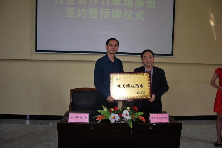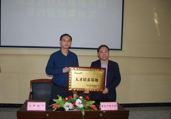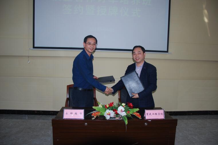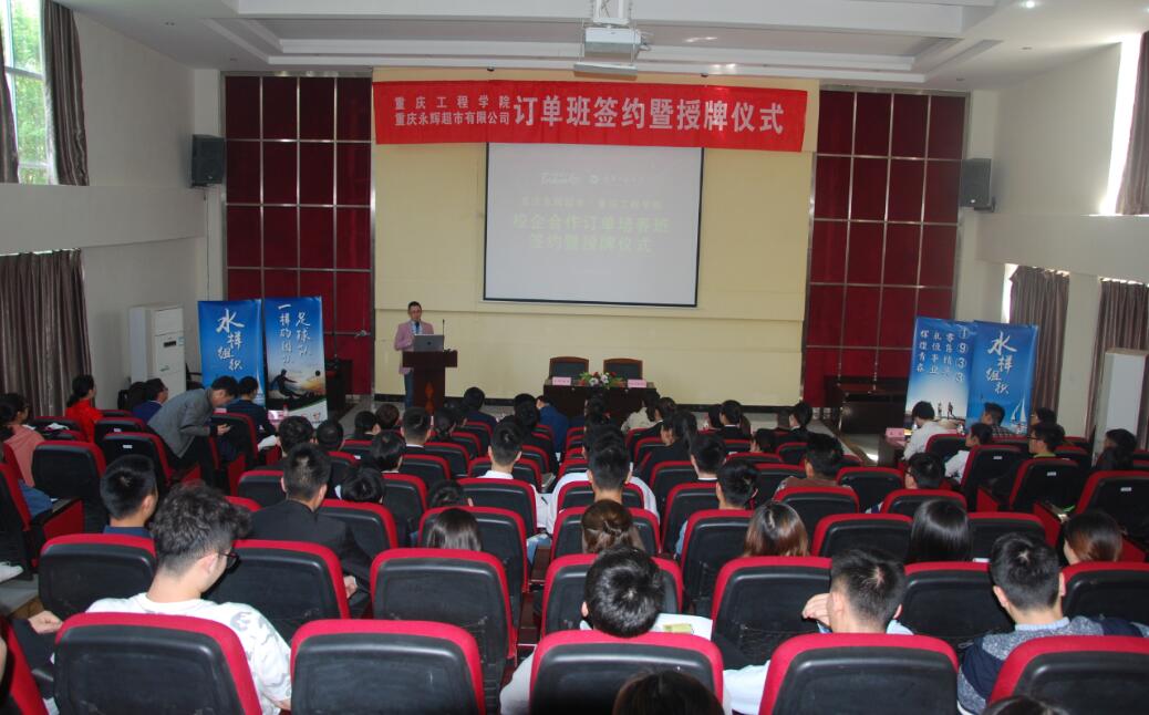 (管理学院 欧晓勇)为进一步加强校企合作,促进创新型应用人才培养,4月2日,我校与重庆永辉超市有限公司在阶梯报告厅举行了“校企合作订单培养班”签约暨授牌仪式。永辉超市重庆大区人力资源总监吴键、渝南区总经理孙文晞、渝南区总经理助理马腾飞、永辉超市重庆大区人力服务平台HRBP李娜、1933项目组杨娟、王粒、李莉,重庆工程学院党委书记兼常务副校长张业平、副校长程昌华、招生就业处处长王建东、管理学院党总支书记邹均、管理学院副院长李玲出席了签约仪式,会议由管理学院院长简玉刚主持。