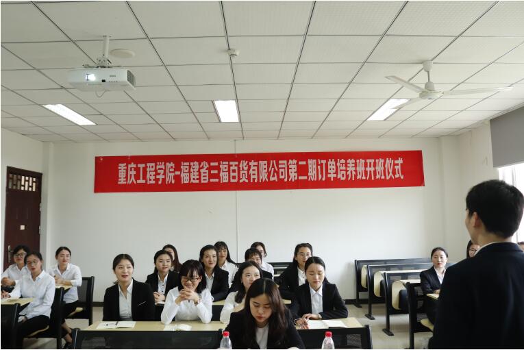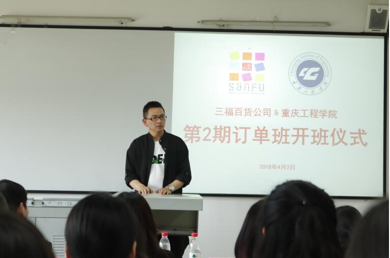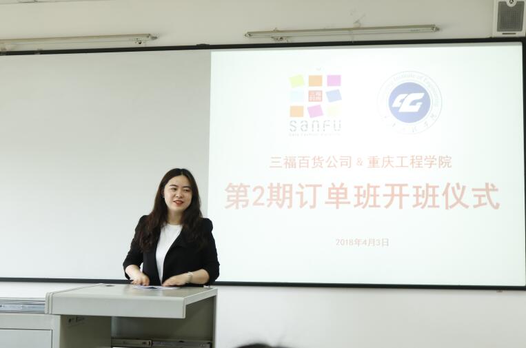 (管理学院 黎芳霞)2018年4月3日13:00,重庆工程学院与福建省三福百货有限公司第2期订单培养班开班仪式,在重庆工程学院6224教室举行。三福百货有限公司西南大区人力资源部经理付莎、西南大区招聘主管赵磊、西南大区培训主管杨雪梅、管理学院院长简玉刚、副院长李玲、实习实训中心主任陈可、工商管理系主任周小波参加本次开班仪式。本次开班仪式由三福订单班班主任黎芳霞主持。