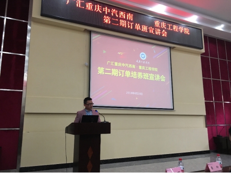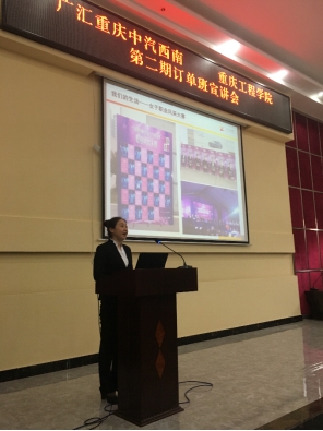 管理学院院长简玉刚进行致辞,对第一期订单班取得的成绩给予了充分肯定,并对第二期订单班提出了要求与期望。随后,广汇汽车重庆区域管店总助彭松就企业文化、发展历程、组织架构、岗位要求等进行宣讲,内容精彩丰富,获得了同学们阵阵热烈的掌声。