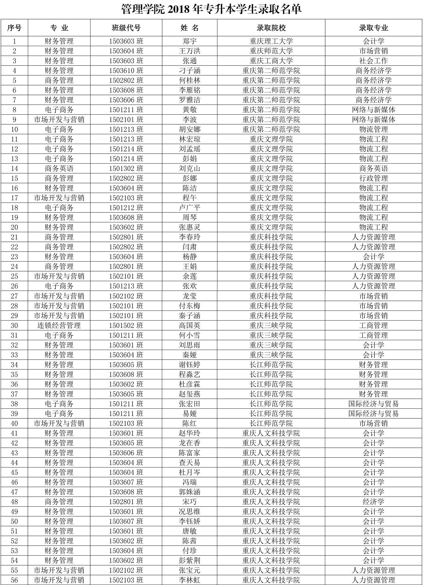 日前,重庆市2018年专升本录取工作全面结束,我校2018届专科毕业生共有128人上线并被录取,其中,管理学院郑宇等56名同学被重庆理工大学、重庆工商大学、重庆师范大学、重庆科技学院、重庆第二师范学院、重庆三峡学院等9所本科院校录取,上线及录取人数居全校首位,占全校录取总数的43.75%。