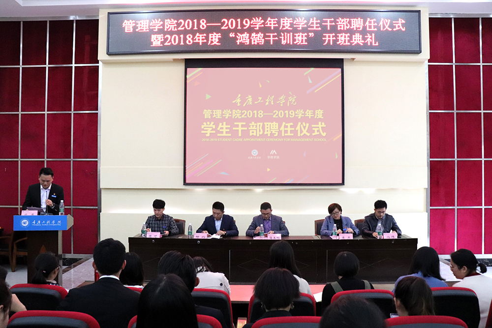 2018年10月16日17:00,管理学院2018—2019学年度学生干部聘任仪式暨2018年度“鸿鹄干训班”开班典礼在行政楼阶梯报告厅举行,校学工部常务副部长黄燕、团委副书记尚伟、管理学院院长简玉刚、党总支书记邹均、副院长陈可及全体辅导员出席本次仪式。学院全体学生会成员、学生助理、班级主要学生干部参与受聘。仪式由学院学生工作室主任兼团委书记付睿主持。