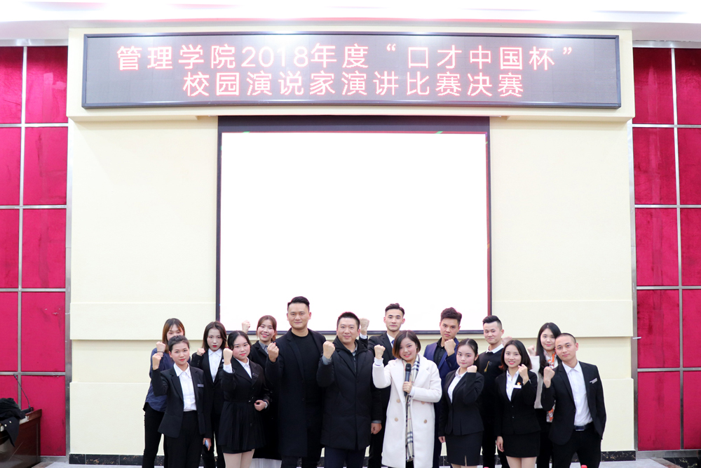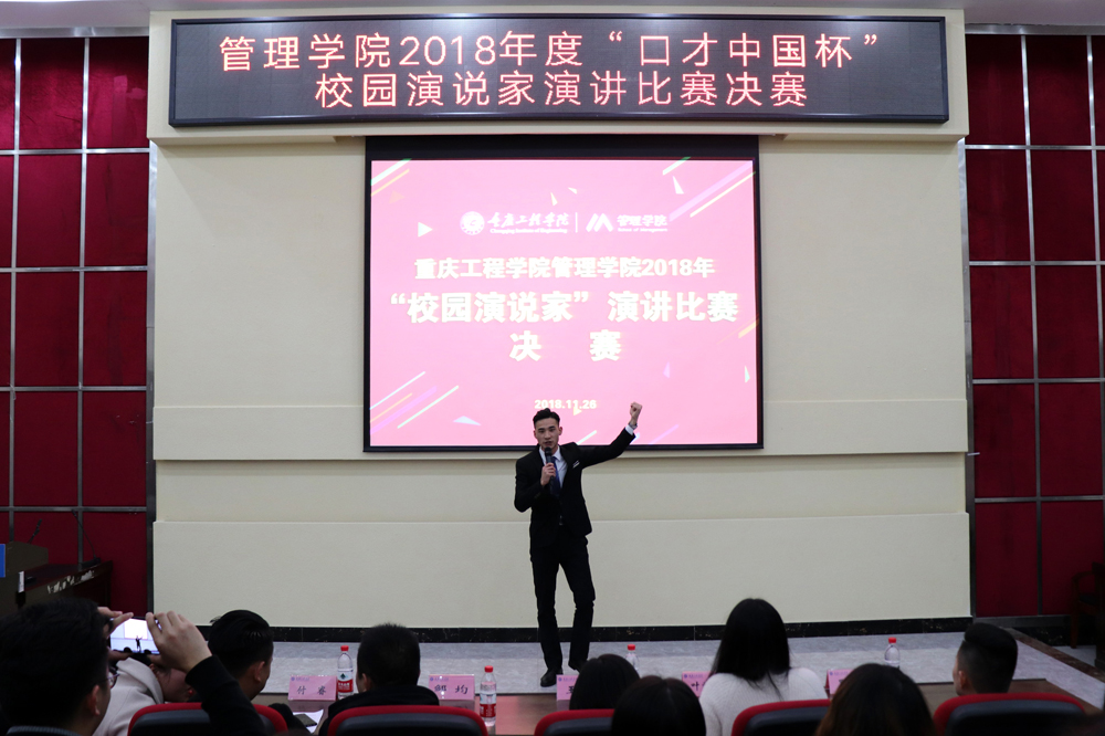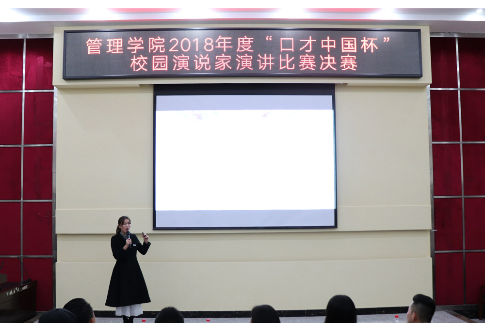 为进一步加强学风、校风建设,丰富大学生文化艺术生活,锻炼同学们的演讲能力和口头表达能力,给同学们提供一个展现自我,提升自我的机会和舞台,提升学生综合素质,2018年11月26日18:30,管理学院2018年度“口才中国杯” 校园演说家演讲比赛决赛在行政楼阶梯报告厅隆重举行,今年的比赛由“口才中国“冠名。“口才中国”是西南地区规模最大、集语言研发及教学培训为一体的大型专业语言教学机构,拥有一流的专业特训基地和雄厚的专家团队。“口才中国”董事长秘书、运营中心主任王瑛,高级咨询顾问罗祖洲、叶秋燕担任本次比赛评委。