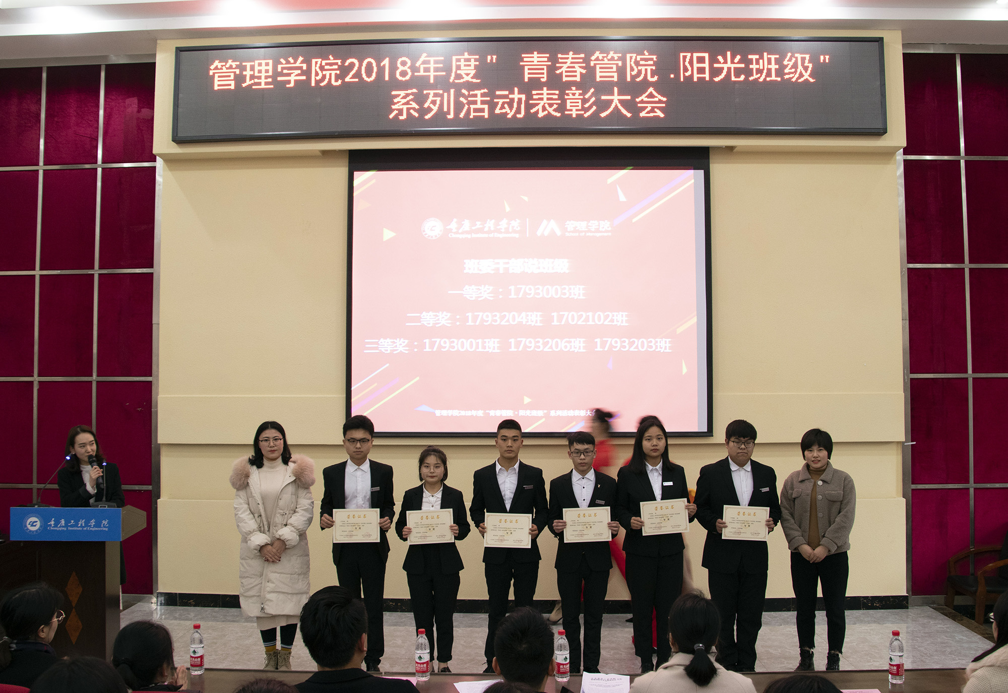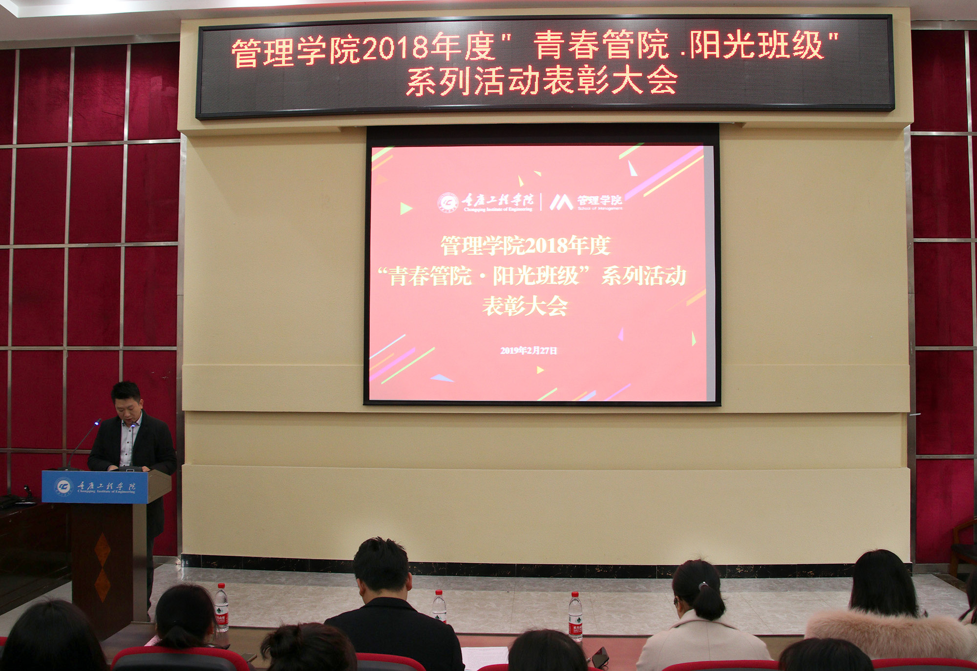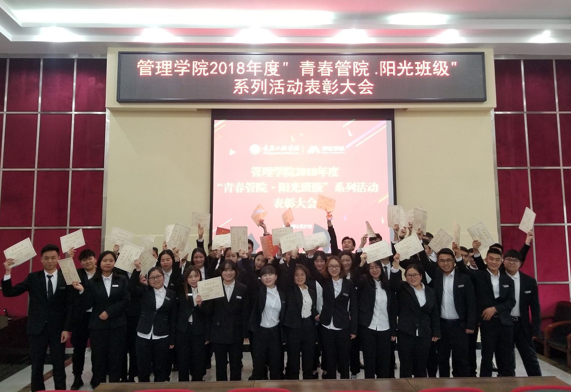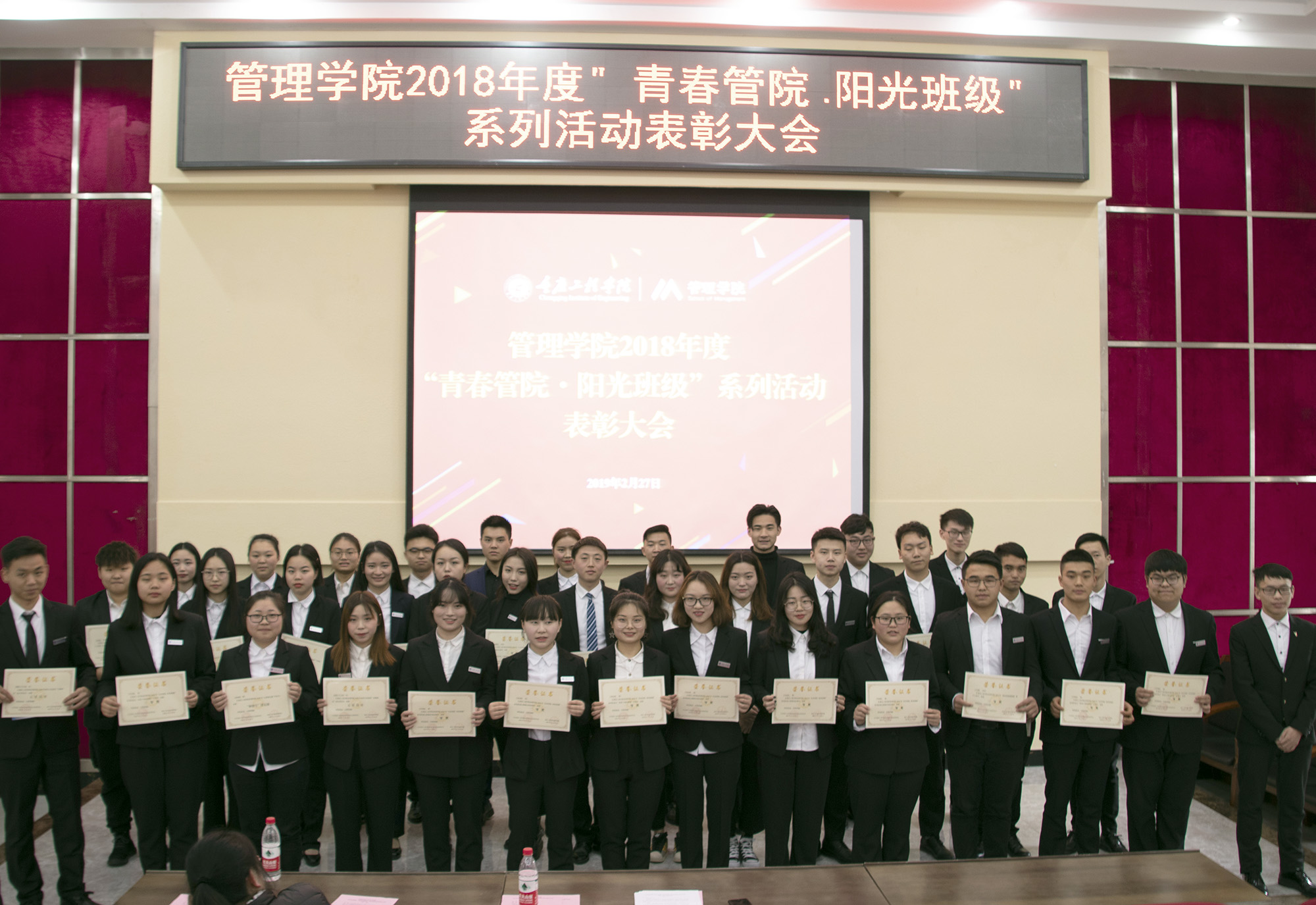 2018年9月至12月,管理学院党总支学生支部组织开展了“青春管院·阳光班级”系列活动,管理学院全体同学踊跃参加。为表彰2018年“青春管院·阳光班级”系列活动中的先进集体及个人,2019年2月27日下午15:50,管理学院学生党支部在行政楼阶梯报告厅召开了2018年“青春管院·阳光班级”系列活动表彰大会。大会由学院艺术实践工作坊秦丽老师主持。管理学院党总支书记邹均及学生工作室全体教师出席大会。