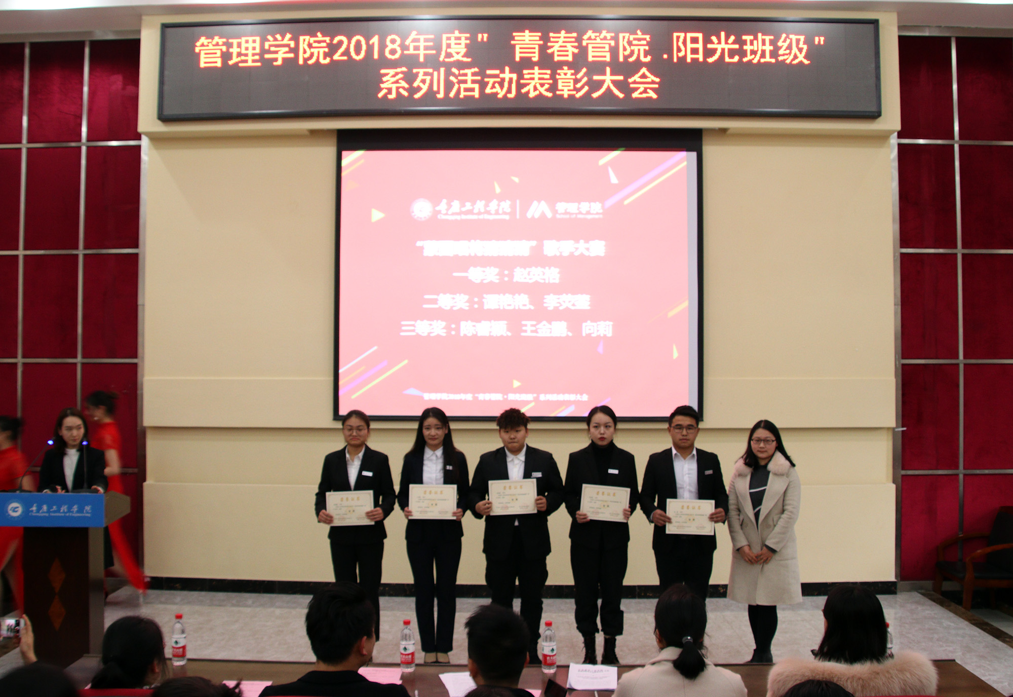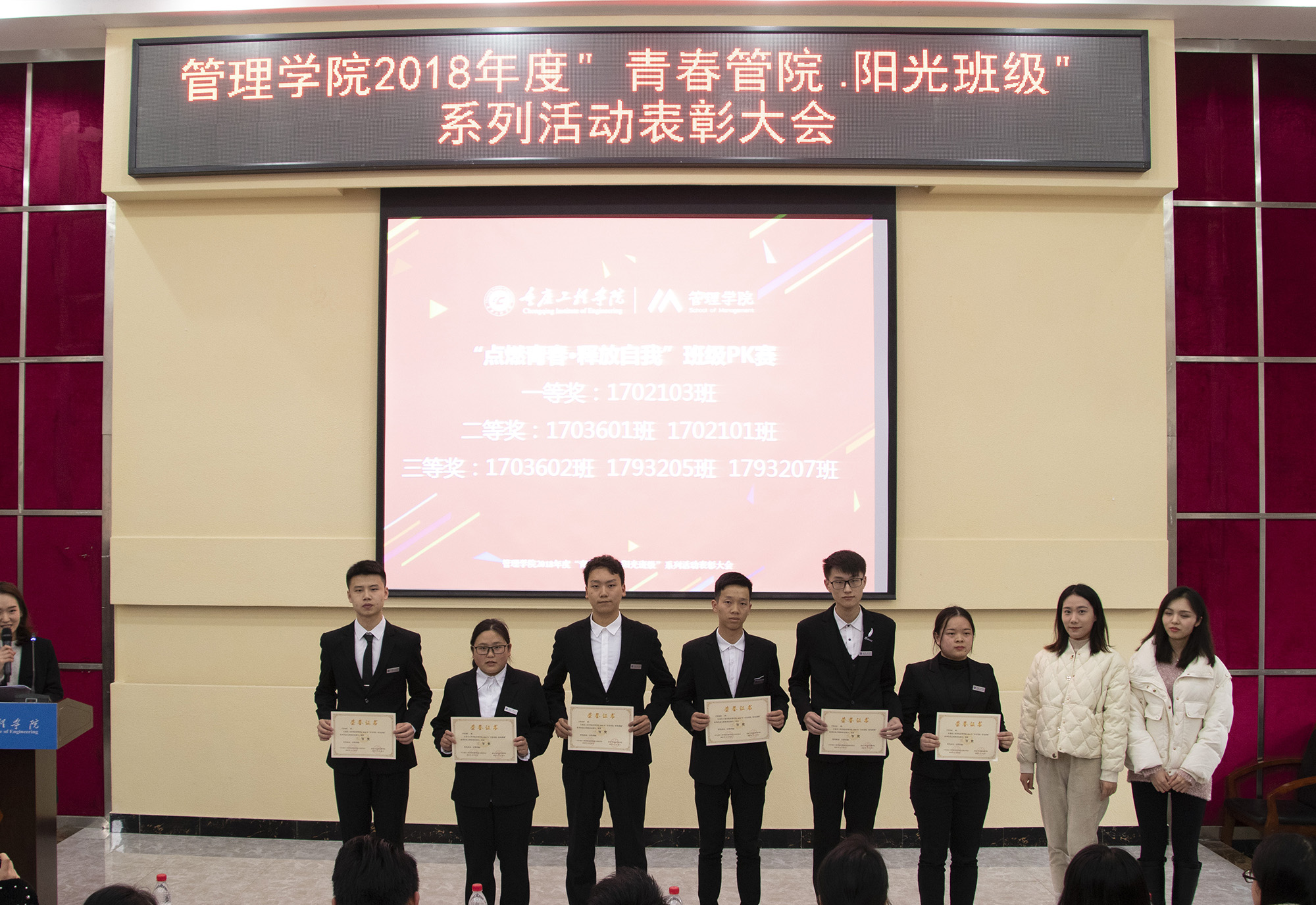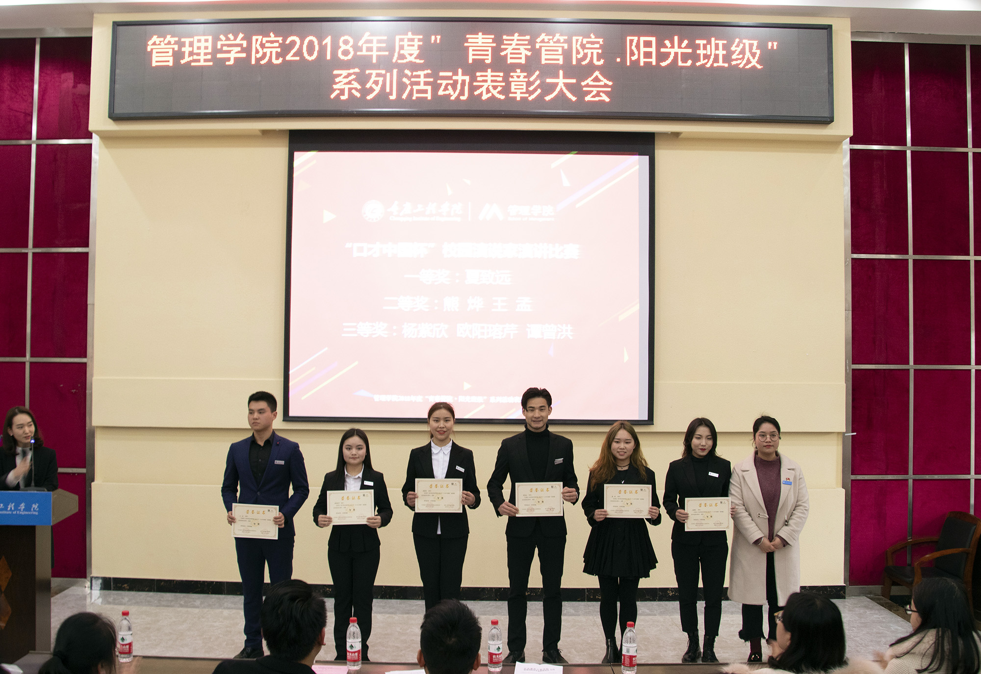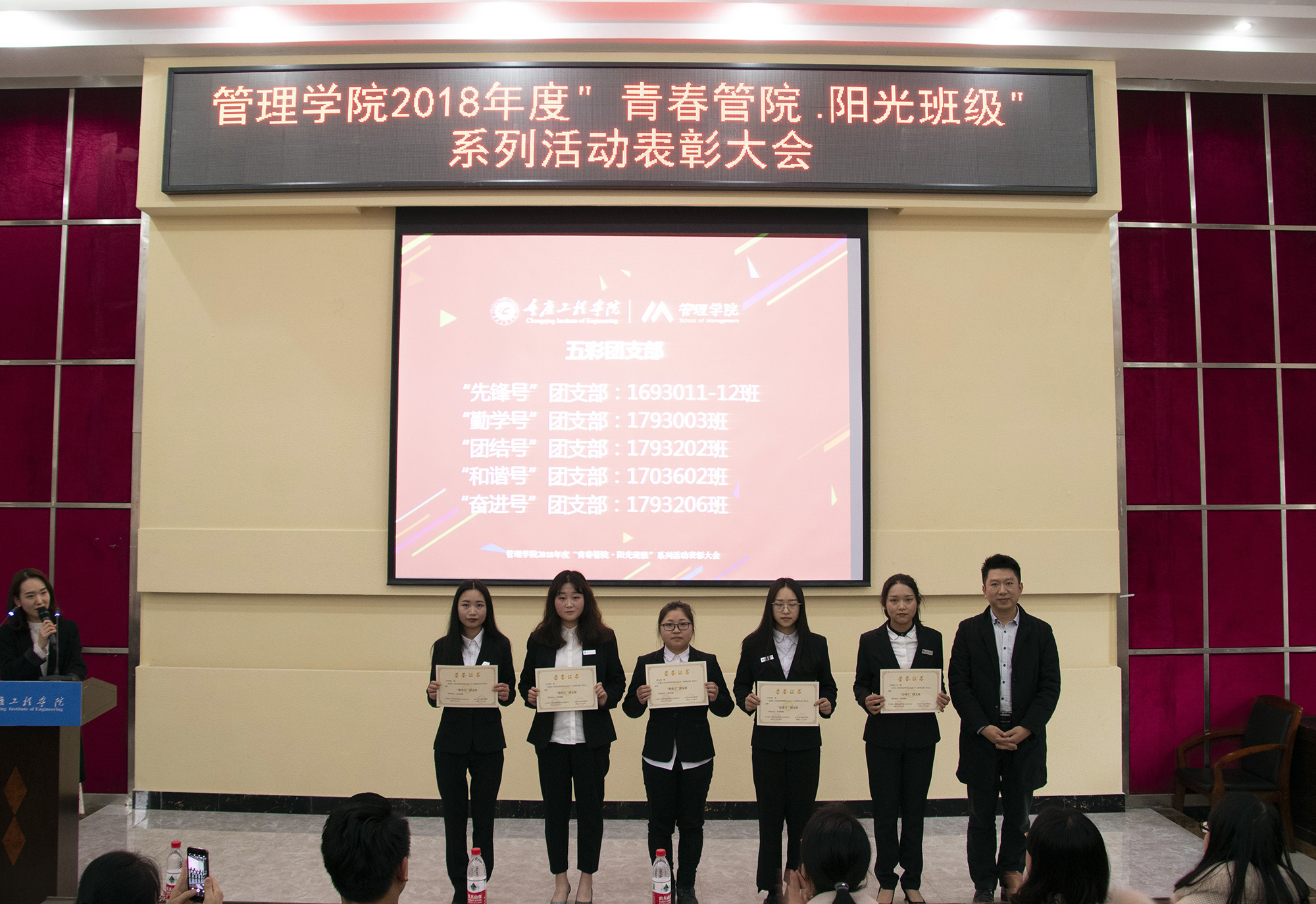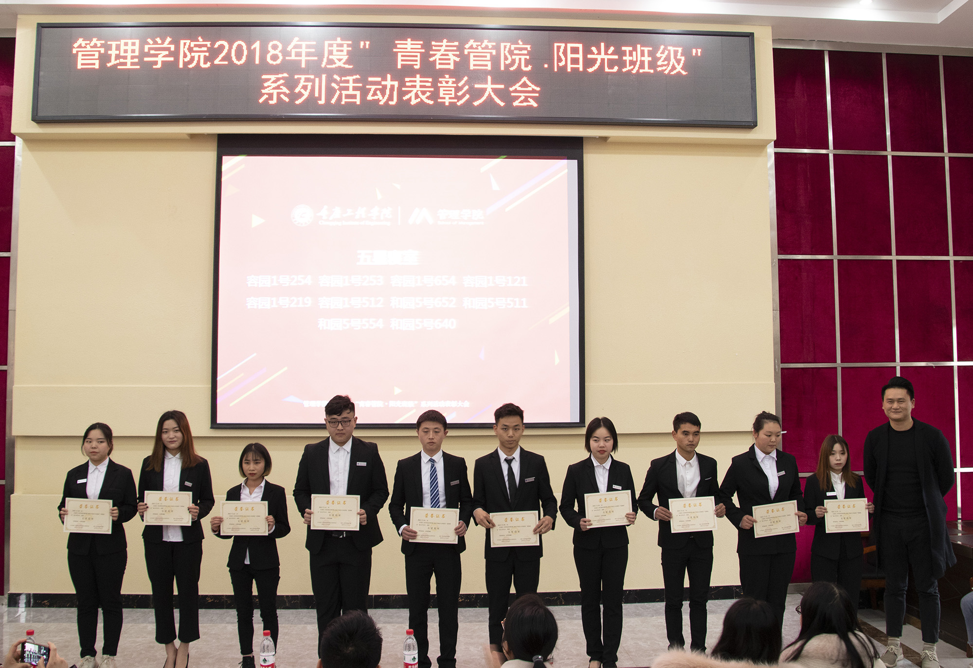2018年9月至12月,管理学院党总支学生支部组织开展了“青春管院·阳光班级”系列活动,管理学院全体同学踊跃参加。为表彰2018年“青春管院·阳光班级”系列活动中的先进集体及个人,2019年2月27日下午15:50,管理学院学生党支部在行政楼阶梯报告厅召开了2018年“青春管院·阳光班级”系列活动表彰大会。大会由学院艺术实践工作坊秦丽老师主持。管理学院党总支书记邹均及学生工作室全体教师出席大会。