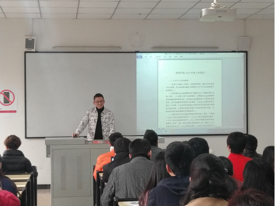 管理学院院长简玉刚向全院教职员工解读了管理学院2019年度工作要点,主要包括2019年工作总体思路、总体目标以及核心工作要点等。简院长强调,根据学校2019年工作要点,管理学院要圆满完成学校下达的2019年度工作目标任务,确保2021年各项合格评估工作100%达成学校要求,并且各专业的学位评估100%达成。