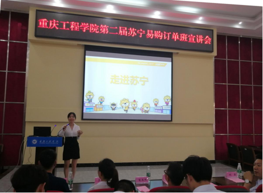 会上,管理学院院长简玉刚对苏宁易购公司给予我校在校企合作工作的支持表示感谢,指出苏宁易购订单班培养了很多优秀的学生,希望同学们珍惜这样难得的机会。苏宁重庆地区管理中心副总经理陈红艳总结了上一届订单班总体情况,全面介绍了苏宁集团的企业文化、八大业务板块、苏宁重庆大区的发展状况,以及本次订单班的招聘岗位、晋升通道、培训体系,欢迎同学们加入苏宁大家庭。我校19届优秀学生代表涂国军、徐萍同学分享了在苏宁的学习成长经历。