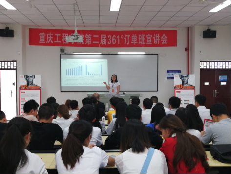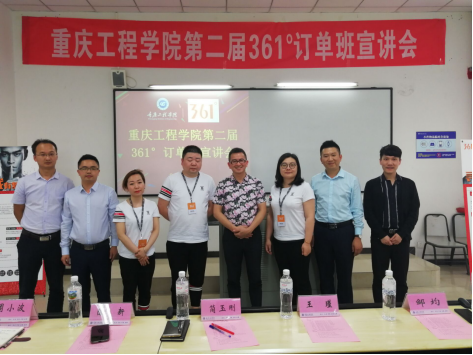 2019年5月22日13:00,管理学院在六教202教室举行了第二届361°订单班宣讲会。361°重庆公司总经理单通、零售总监王瑾、商品总监王渝平、人事经理陈新、总经理助理刘天利、管理学院院长简玉刚、党总支书记邹均、副院长陈可出席了宣讲会。会议由管理学院工商管理系主任周小波主持。