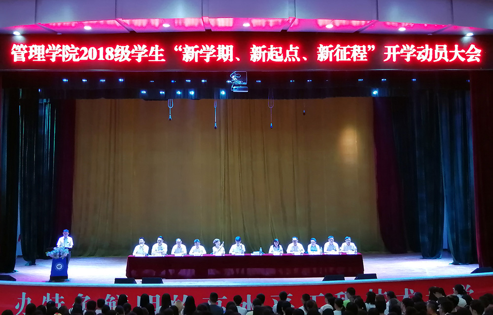 2018年9月1日18:30,管理学院2018级学生“新学期、新征程、新起点”开学动员会在学术报告厅隆重举行。管理学院院长、副院长、办公室主任、就业科长、实习实训中心主任、各系主任、2018级全体学生及辅导员,共千于人参会。本次动员大会由管理学院党总支部书记邹均主持。