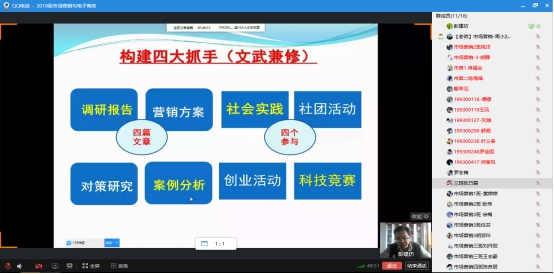 为了加强市场营销本科学生的专业认知,提高专业学习兴趣,顺利完成从大一通识教育到大二专业教育的转变。4月17日14:00,工商管理系邀请学术带头人彭建仿教授,通过QQ直播,为2019级本科市场营销专业学生,开展了一场讲解与互动相结合的专业教育活动。