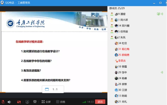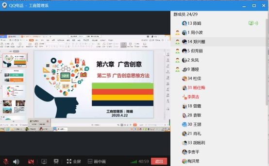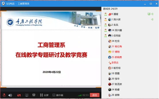 为进一步有效推进在线教学工作,保障在线教学与课堂教学实质有效,不断提高教学质量,4月22日下午,工商管理系通过QQ视频会议召开了在线教学专题研讨会。管理学院梅洪常院长全程参会并作指导性讲话,会议由潘娅老师主持,工商管理系全体教师参加。