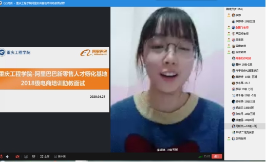 为了让2018级电子商务专业的学生尽快融入到阿里项目的实训课程中,让同学们了解阿里企业文化,学习阿里巴巴新零售人才需具备的基本业务知识。2020年4月20日晚20:00,重庆工程学院-阿里巴巴新零售人才孵化基地开展了2018级电子商务实训课程培训师助教面试。