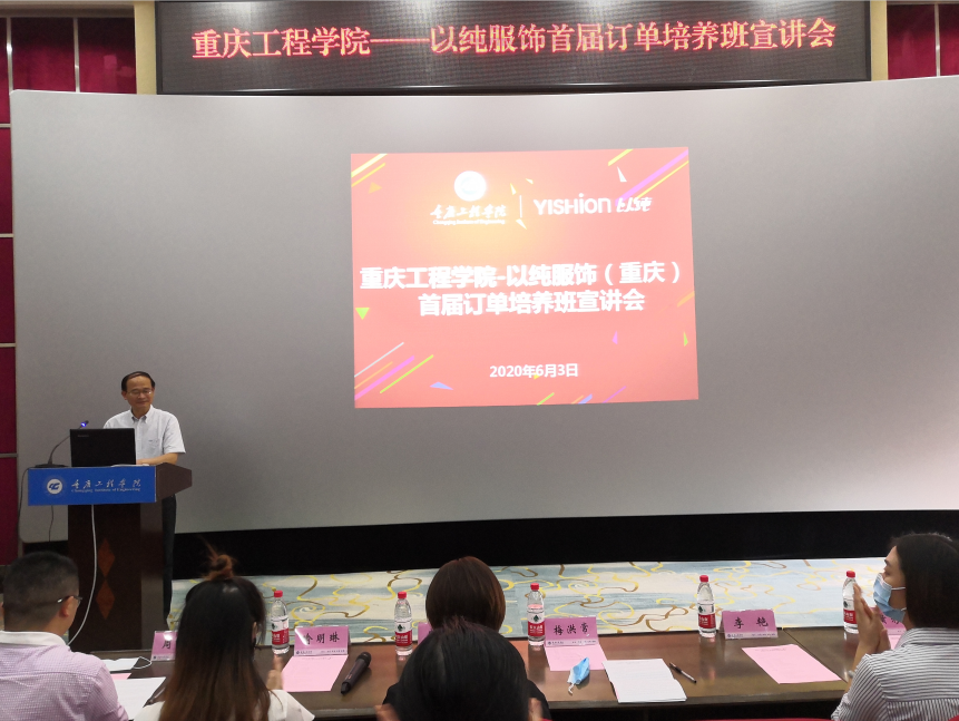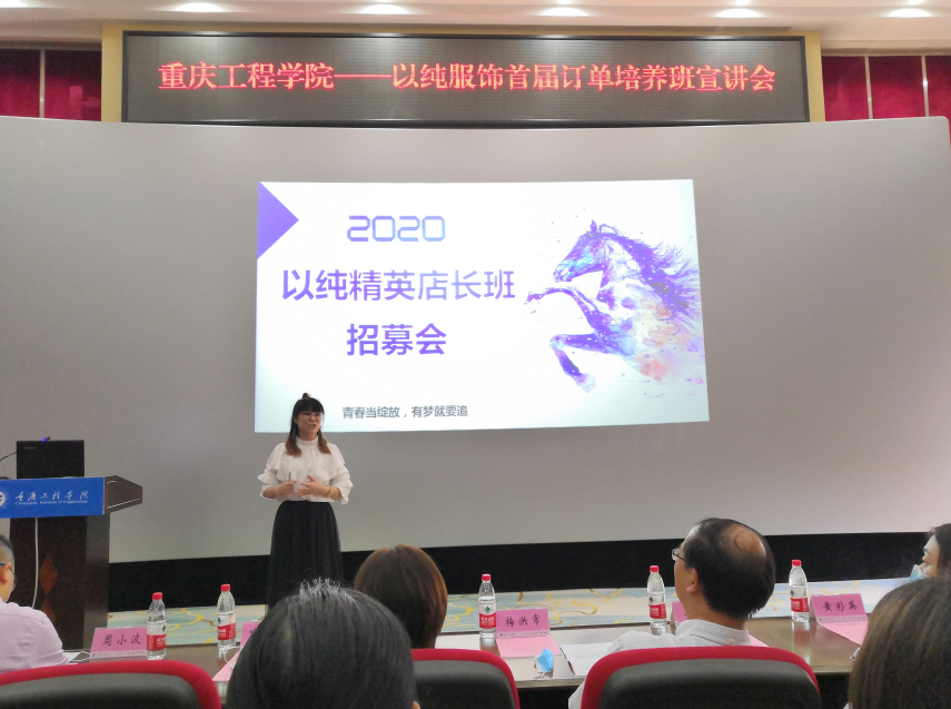 6月3日,管理学院在阶梯报告厅举行了市场营销专业以纯服饰首届订单班宣讲招聘会。以纯重庆办事处副总经理扈晓、人力资源经理李艳、校企合作组经理喻明琳、校企合作组主管黄彩英一行到校进行宣讲及面试。重庆工程学院管理学院院长梅洪常、工商管理系主任周小波、实训中心主任张中义、就业科长王燕楠及2018级专科市场营销专业同学参加了此次宣讲会,会议由工商管理系主任周小波主持。