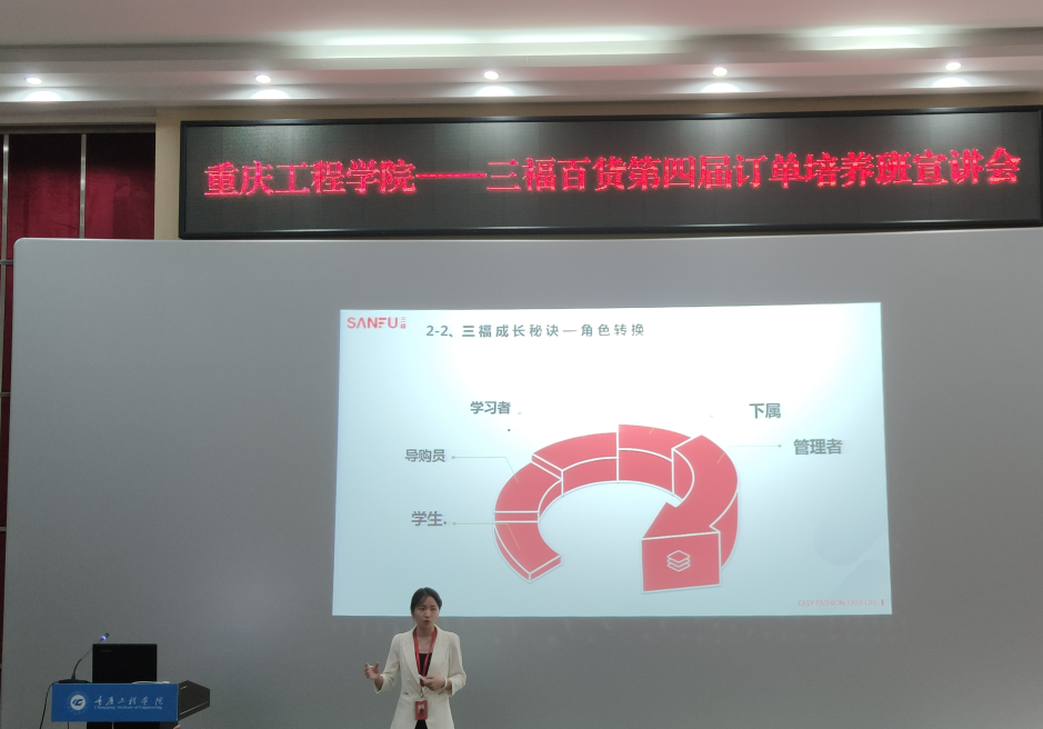 周小波主任介绍了到场主要领导和合作背景。重庆工程学院管理学院院长梅洪常致辞,梅院长提到“在重庆工程学院和三福公司主要领导的高度重视及关注下,三福订单班的运行比较成功,目前已培养出曾磊等15位店长或储备店长;代春梅,陈思名等17位门店主管;左玉等7位职能部门专员。希望与三福百货建立多方面合作,建立长效合作机制、深化合作内容、扩大合作规模、实现优势互补,促进学院人才培养模式的创新与发展。