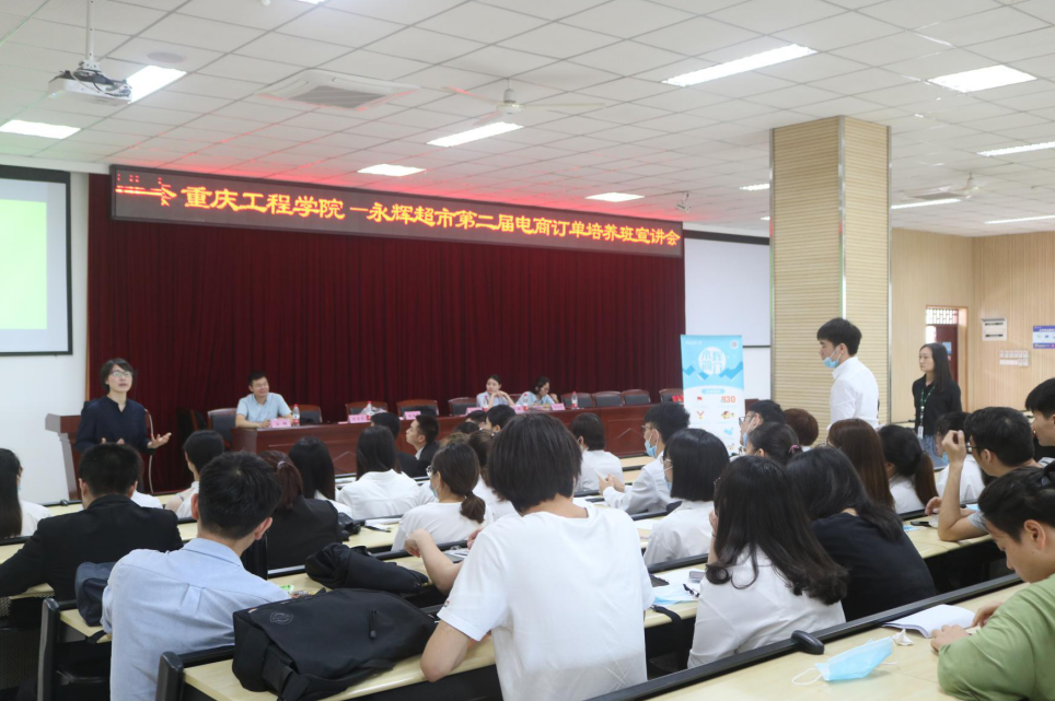 会议由电子商务系主任宋超主持,永辉超市股份有限公司人力资源招聘总监王粒、重庆永辉超市人力资源经理郑丹凤、重庆永辉超市人力资源经理蒋元利、管理学院院长梅洪常、永辉订单班班主任廖俊及2017级电子商务本科专业学生参与。