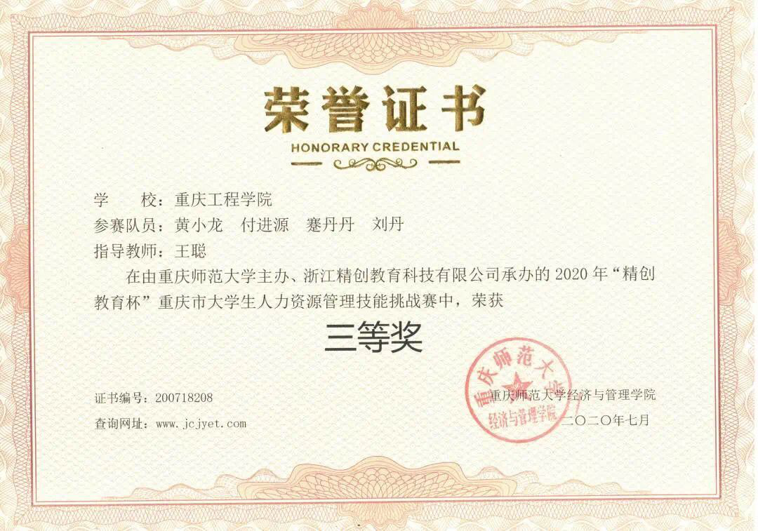 从2020年9月9日重庆市大学生人力资源管理技能大赛官网获得的消息,我校人力资源管理系2019级参赛学生获得本次重庆市大学生人力资源管理技能挑战赛市级三等奖。2020年7月18日,由重庆师范大学经济与管理学院主办的第一届“精创教育杯”重庆市大学生人力资源管理技能挑战赛以腾讯会议的组织形式开展。竞赛采用浙江精创教育《人力资源管理智能仿真与竞赛对抗平台系统》,采用分组对抗与模拟实战的方式,各参赛队组建不同的公司,基于同一市场环境下,各公司相互对抗竞争。通过在规定时间内对竞赛系统内置的人力资源规划、工作分析中心、招聘与甄选中心、培训与开发中心、绩效管理中心、薪酬管理中心、员工关系管理中心、产品中心这八个模块的操作,实现人力资本投资回报率和人力价值的提升。