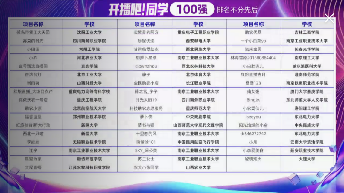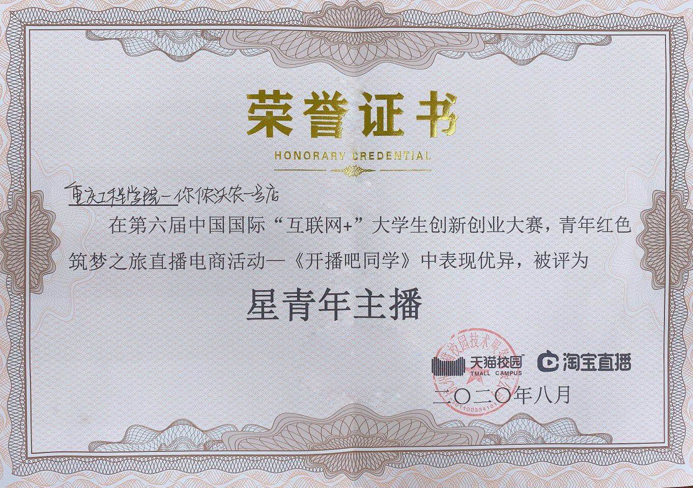 2020年9月3日,第六届中国“互联网+”大学生创新创业大赛,青年红色筑梦之旅直播电商活动——《开播吧同学》全国高校直播大赛总决赛颁奖典礼在杭州落下帷幕。管理学院市场营销专业“你侬沃农”团队,经过两个月时间奋力拼搏,荣获全国“星青年主播”称号。