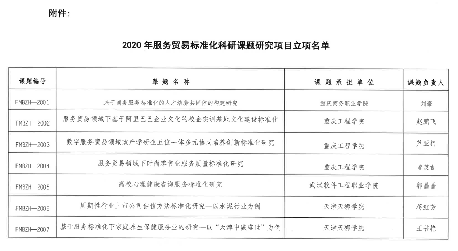 近日,从中国标准协会传来喜讯,经过层层严格审查与专家评审,重庆工程学院三名教师申报的科研项目在全国所有申报项目中脱颖而出,成功获得立项。其中赵鹏飞老师的《服务贸易领域下基于阿里巴巴企业文化的校企实训基地文化建设标准化》,芦亚柯老师的《数字服务贸易领域政产学研企五位一体多元协同培养创新标准化研究》,李英吉博士的《服务贸易领域下时尚零售业服务质量标准化研究》申报成功。这是我校教师首次申报中国标准化协会主办的服务贸易标准化科研课题,为以后开展服务贸易标准化工作中共性问题和标准化理论的研究、学术交流以及开展多种形式的标准化工作经验、成果推广应用等活动奠定坚实的基础。