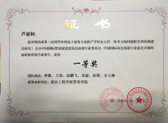 近日,从中国国际贸易促进委员会商业行业委员会传来喜讯,经过层层严格审查与专家评审,重庆工程学院管理学院芦亚柯教师申报的商科教育教学成果在全国所有申报的商科教育教学成果中脱颖而出,成功获得一等奖。这是我校教师首次申报中国国际贸易促进委员会商业行业委员会主办的商科教育教学成果,为以后聚力质量提升,引领教学改革方向,直面当前商科教育领域重大现实问题或应对未来挑战,服务于学校教育教学中心工作奠定了坚实的基础。