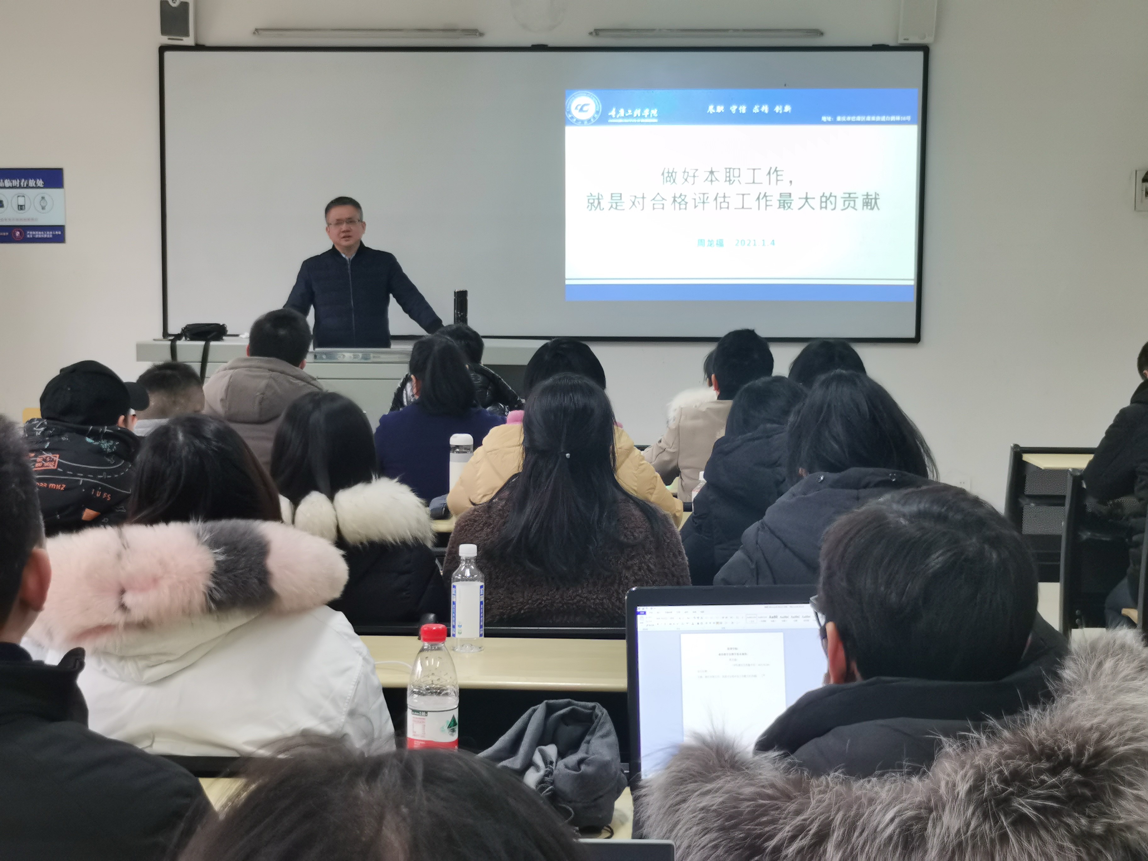 周助理以“做好本职工作,就是对合格评估工作最大的贡献”为主题展开了此次培训。首先,周助理就期中教学检查发现的教师常规教学材料存在的问题一一举例展示,希望老师们引以为戒,在以后的教学材料制定中不要再出现类似错误;接下来周助理对课堂听课情况进行了总结,分别例举了6位教师在课堂教学中存在的问题,强调要上好一堂课需要教师在具备扎实教学基本功的前提下还必须做到教学目标清晰、教学内容适度、教学方法有效、教学进程合理、教学环境良好、课后辅导充分等。基于教学材料制定和教学实施问题总结,周助理提出要成为一名合格教师,需要从理论高度、知识深度方面去提升自己,修炼基本功,潜心教书育人;同时,二级学院应建立完善的教学质量保障体系以形成教学质量监控、反馈、完善闭环,保障教学实施质量。最后周助理希望老师们回归常识、回归本分、回归初心、回归梦想,为提升教学质量不懈努力,为我校本科合格评估工作尽全力。