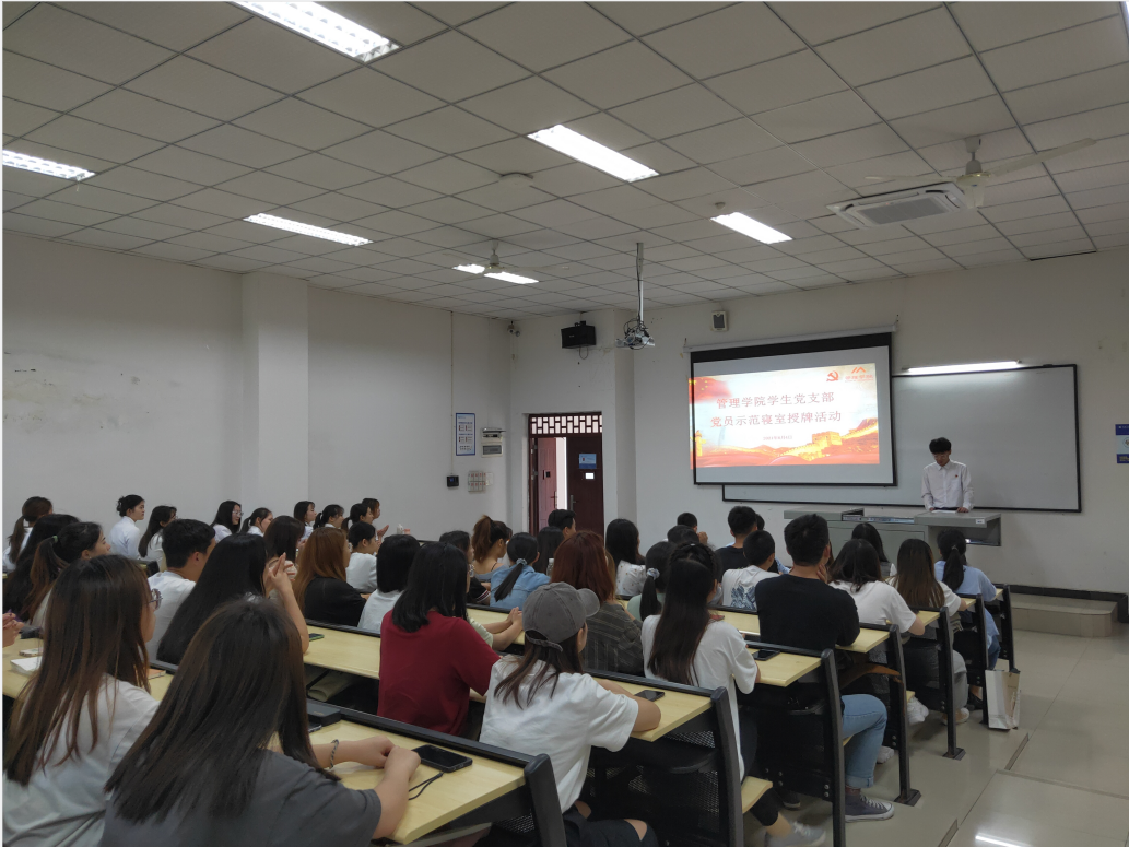 为发挥学生党员的先锋模范作用,全面贯彻落实党员的“五个带头”作用,贯彻学校提出的寝室“五个一”,营造出一个良好的寝室生活、学习环境。2021年6月4日12: 30,管理学院在六教204开展了党员示范寝室授牌活动。参与本次活动的有管理学院党总支书记刘达斌、学生第一党支部书记宋曼、学生第二党支部书记曾艳灵、学生第三党支部书记王燕楠以及50名同学。