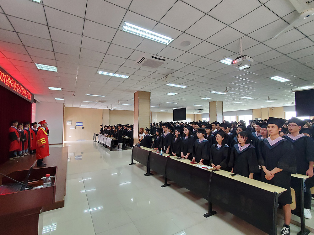 仪式在雄壮的国歌声中拉开帷幕。彭建仿院长宣读了《2021届毕业生学士学位授予决定》,学院本次为620名本科生授予学士学位。毕业生们身着学位服,按照顺序分批上台,院长彭建仿教授带领学院学位评定分委员会全体委员共同为毕业生代表逐一拨穗、颁发证书并合影留念。仪式结束后,毕业生代表向学位评定分委员全体成员献上鲜花,感谢师恩、感谢学校学院培养之情。