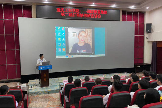 戴经理还带来了目前在广东大区发展的2016级学生李银梦的分享视频,视频中,李银梦分享了自己生活和工作的经历,从来到涪陵榨菜的最初感受到自己的逐渐蜕变,表示了对学校和公司的感谢,也表达了对学弟、学妹们的深切祝福,情真意切的言辞赢得了阵阵掌声。