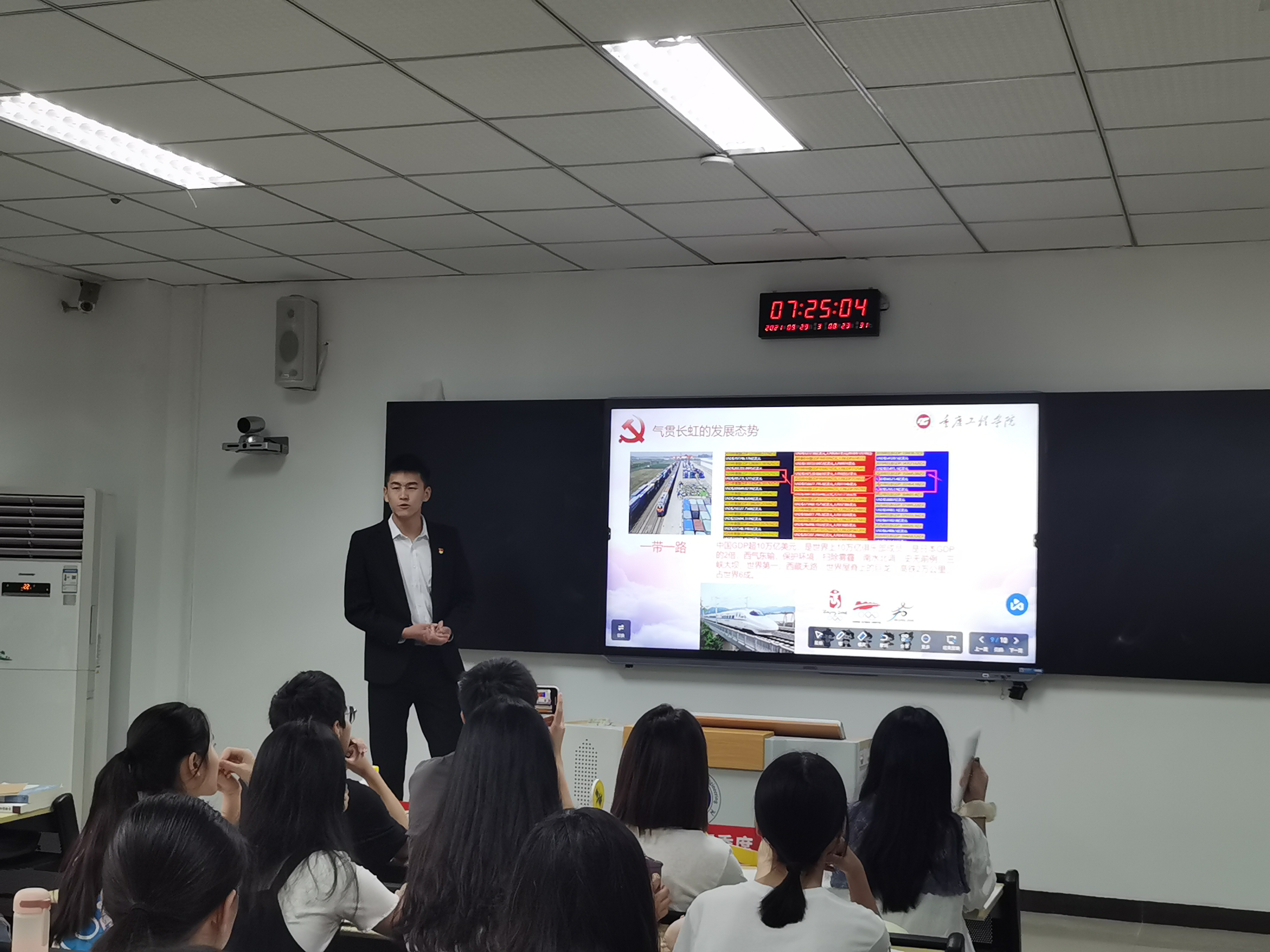 为庆祝伟大祖国72周年华诞,弘扬爱国主义精神和集体主义精神,讴歌社会主义的美好生活,展现重工学子的精神风貌,2021年9月29日7:00,管理学院学生党支部在第六教学楼开展了以“盛世迎国庆”为主题的“大学生微党课”进班级活动。8位2019级预备党员走进晨课教室,为2020级同学们进行宣讲。