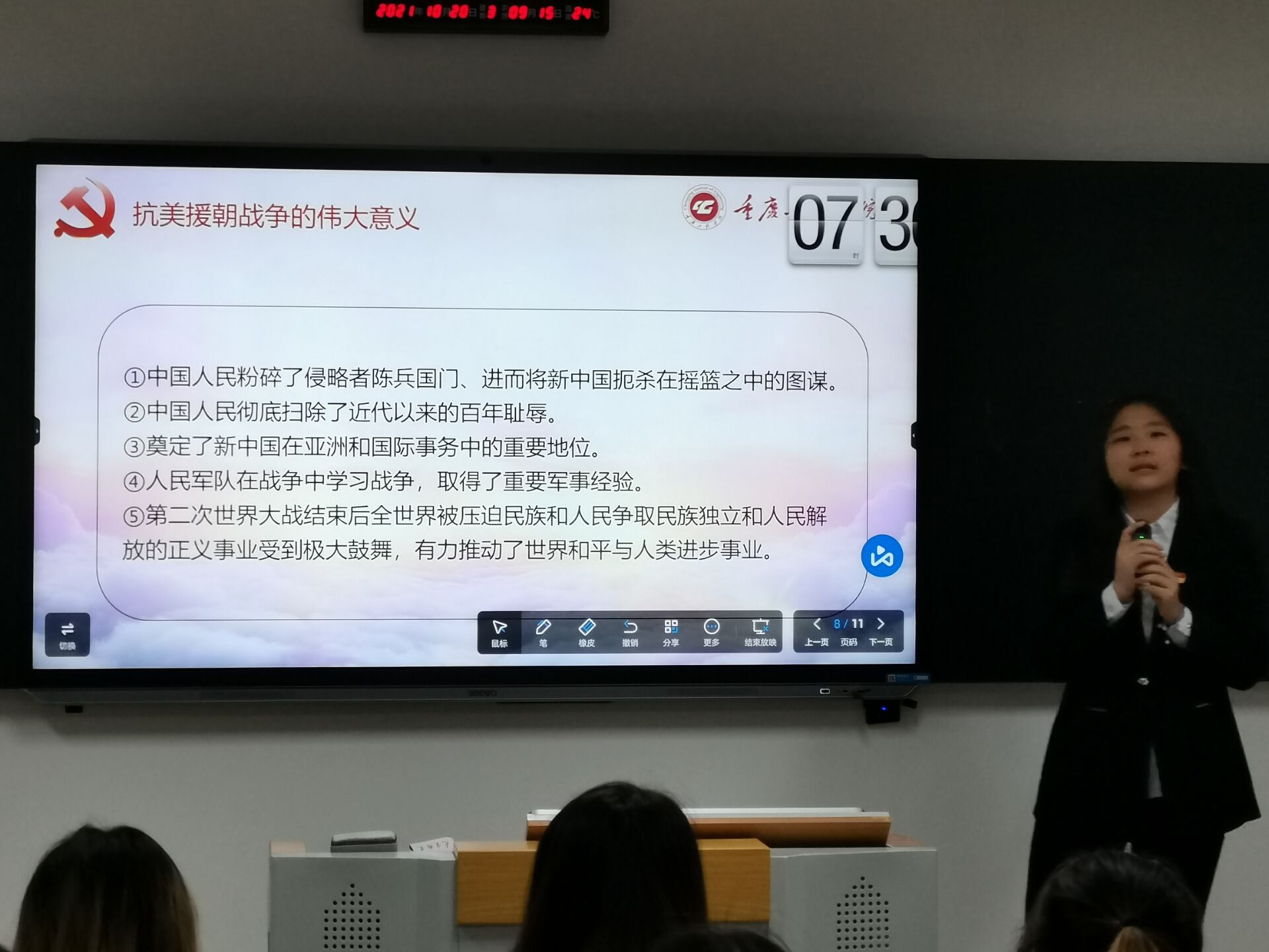 为进一步弘扬伟大的抗美援朝精神,激发同学们内心的爱国主义精神,2021年10月20日,管理学院2019级8名学生预备党员走进晨课课堂,开展了“大学生微党课”进班级活动,向2020级同学们宣讲抗美援朝精神。