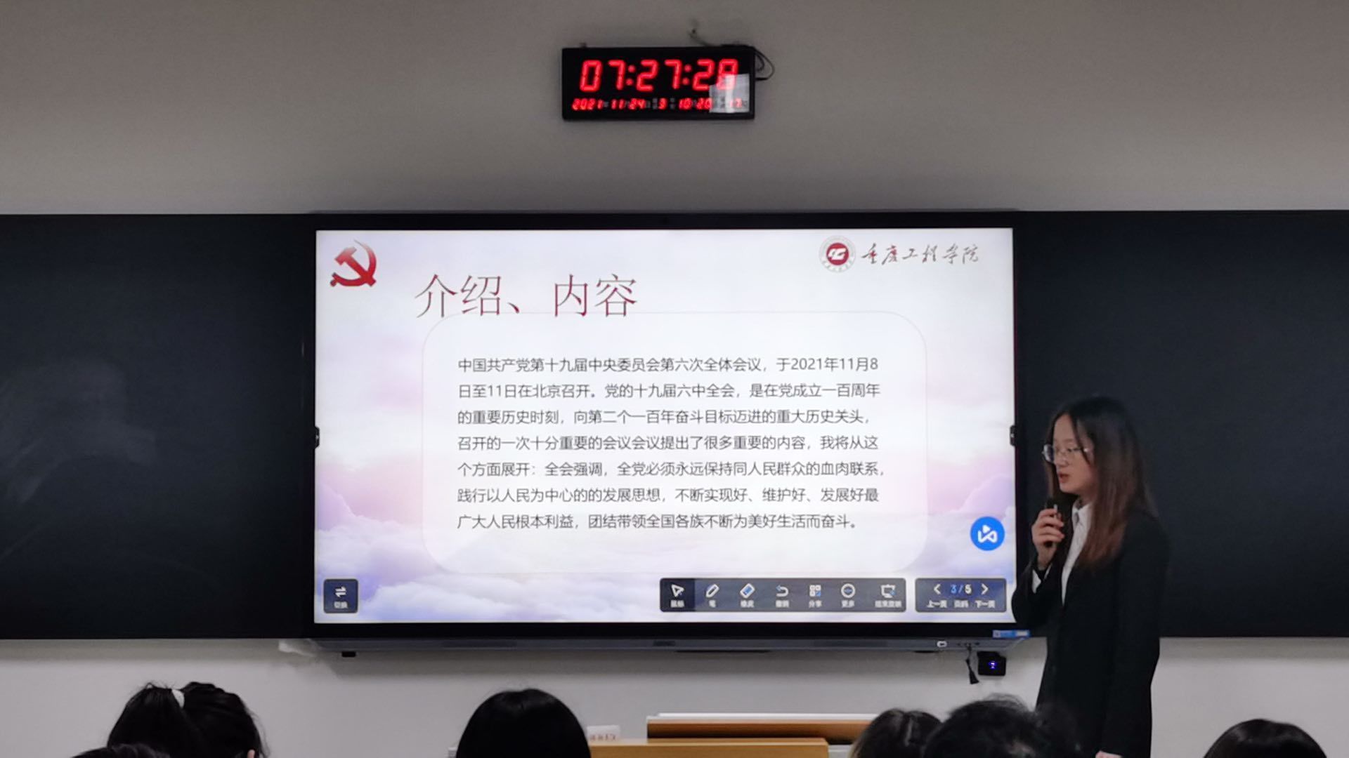 为引导广大学生关注时事政治,心系党和国家的发展命运,关注形势发展,学会独立思考问题,2021年11月24日7:20,管理学院学生党支部在第六教学楼开展了“大学生微党课”党员演讲进班级活动之时政热点分享。8名2019级预备党员走进晨课课堂,向2020级的同学们进行宣讲。