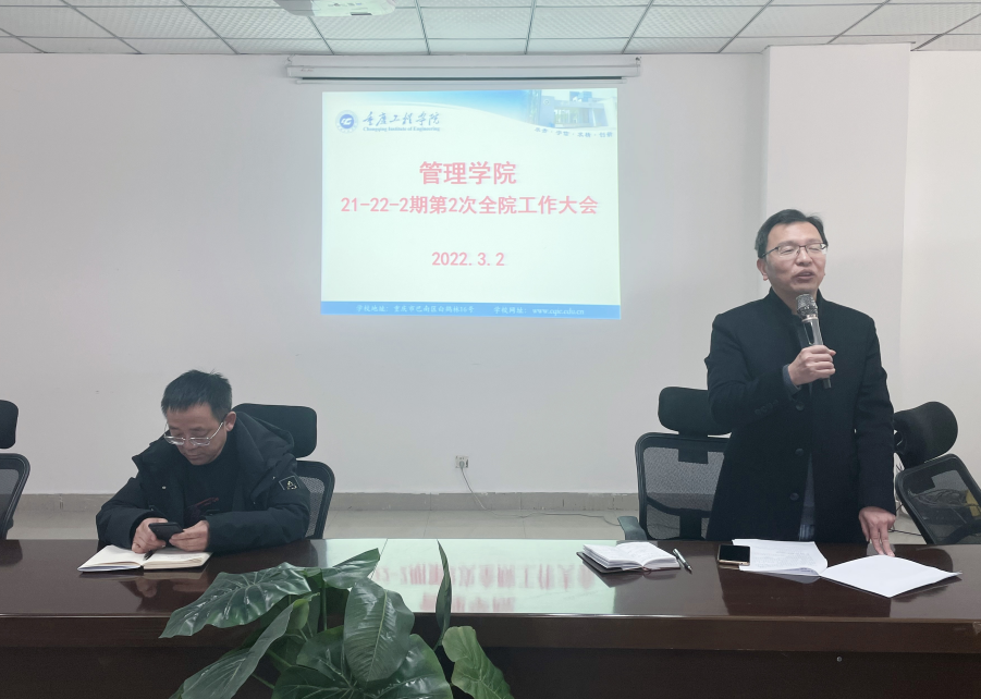 彭建仿院长解读管理学院2022年考核任务书重点工作。一是要毕业设计(论文)和三期检查为契机,做好教学运行规范。二是做好教学建设与校企协同育人,积极将科研成果反哺教学。三是根据学校工作安排,全院全员积极开展说专业、说课程、说管理活动。四是抓好教师项目工作室建设,完成学校下达所在学院2022年横向经费到账任务和教师项目工作室上座率任务。五是重视(新)教师培养,提升教师教学能力和实践能力,以教学竞赛为抓手做好梯队人才孵化。六是做好学生工作和服务,紧抓毕业生就业工作。七是抓好科研管理和项目管理。八是疫情防控、安全工作不放松。