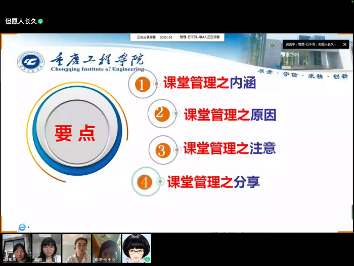 课堂管理的技巧是衡量一位好老师的标准之一,为了提升新教师的课堂管理技巧,帮助新教师尽快站稳讲台,结合疫情管控等因素,2022年3月16日,但秀丽为新教师开展了课堂管理线上专题培训。