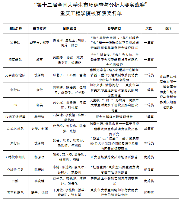 校赛一等奖、二等奖和三等奖获奖团队将代表我校参加第十二届全国大学生市场调查与分析大赛实践赛重庆地区选拔赛,望参加省赛的团队和指导老师精心准备、细心打磨,赛出好成绩,展现我校风采。获奖团队的证书后续统一发放。