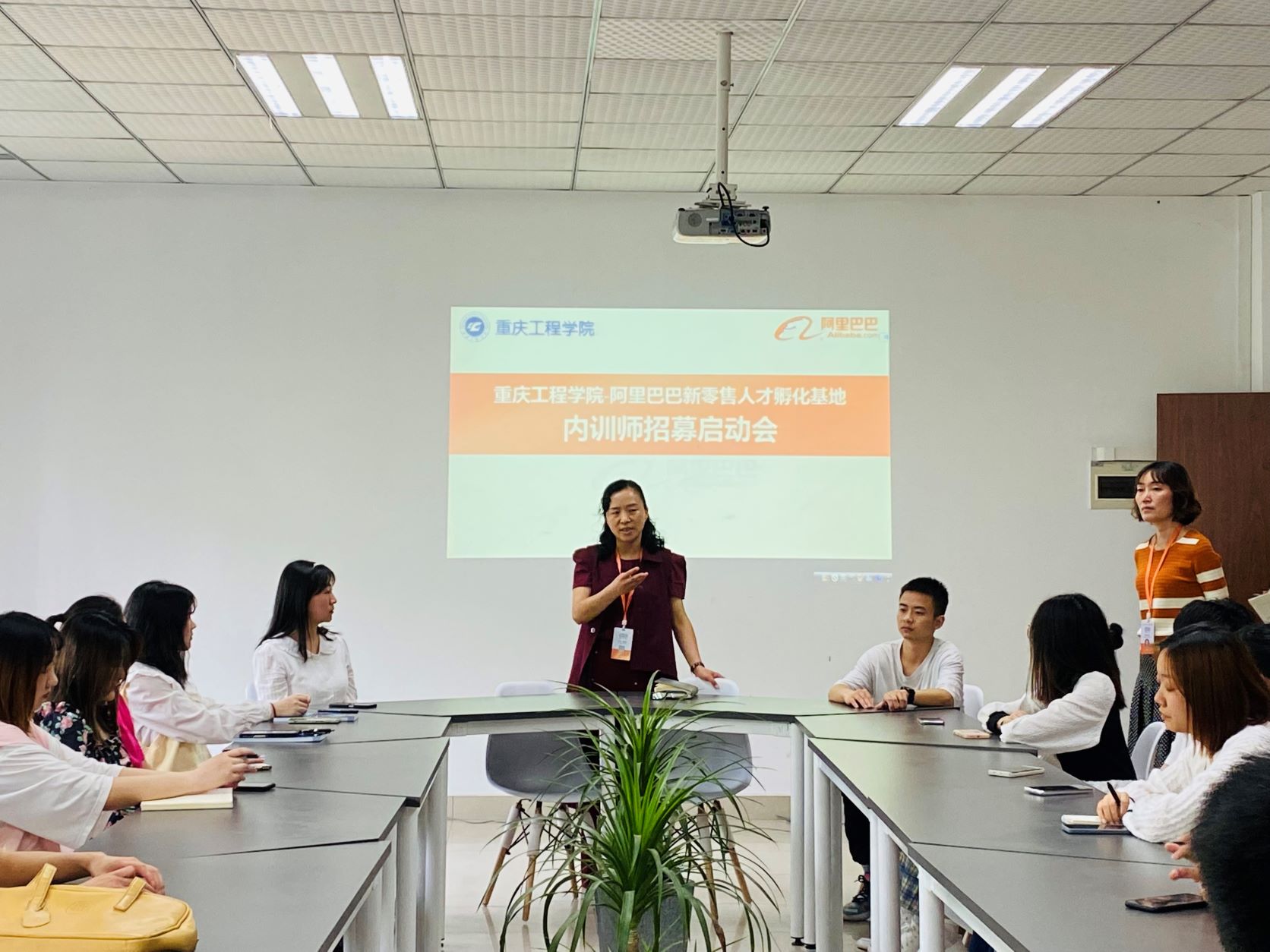 重庆工程学院阿里巴巴新零售人才孵化基地2021-2022学年第二学期内训师招募启动会于4月11日在第三教学楼进行。参与本次启动会的领导和老师有:重庆工程学院管理学院工商管理系专职教师兼阿里基地负责人曾霞,重庆工程学院管理学院电子商务系专职教师兼阿里基地实训班主任卫莉,重庆工程学院电子商务系专职教师兼阿里基地实训班主任赵鹏飞,重庆工程学院管理学院教学秘书兼阿里基地实训班主任陈皓月,以及阿里基地的职能岗们。