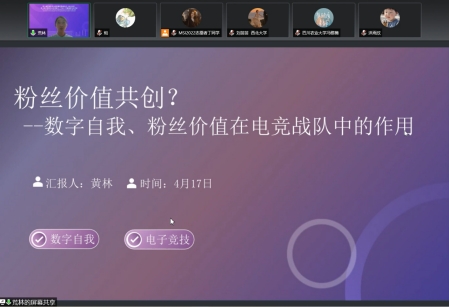 由西郊利物浦大学举办,中国高等院校市场学研究会、首都经济贸易大学工商管理学院、Technological Forecasting and Social Change联合主办的MSI 2022第六届营销科学与创新国际高峰论坛于2022年4月16日-17日在线上召开,本次年会的主题为《技术预测和社会变革》,我院李英吉副教授应邀参加会议。李英吉老师带领18级黄林同学、杨鑫同学向大会提交了题为“粉丝价值共创?数字自我和粉丝价值在电竞战队中的作用”的论文,并在17日的个体行为分论坛进行汇报。